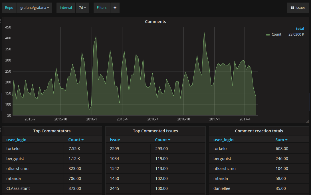 Follow the README for that node.js tool for instructions on how to get GitHub issue and comments data into Elasticseach so you can visualize the data in Grafana using for example this dashboard.