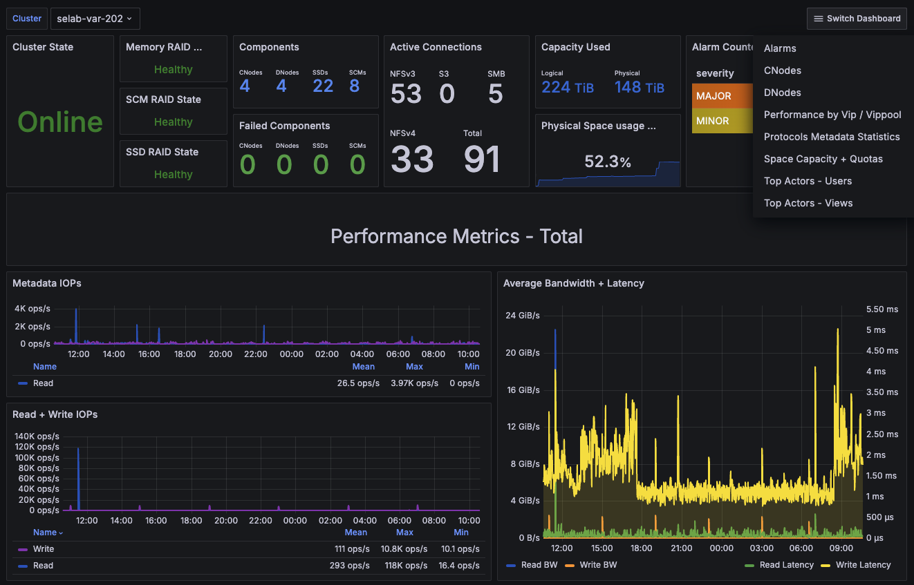 In addition to the in-depth analytics provided in the product UI, VAST clusters have built-in Prometheus exporters for easy integration into existing monitoring infrastructure.