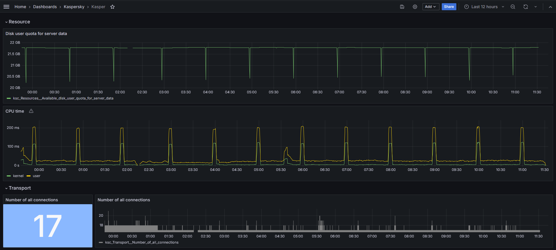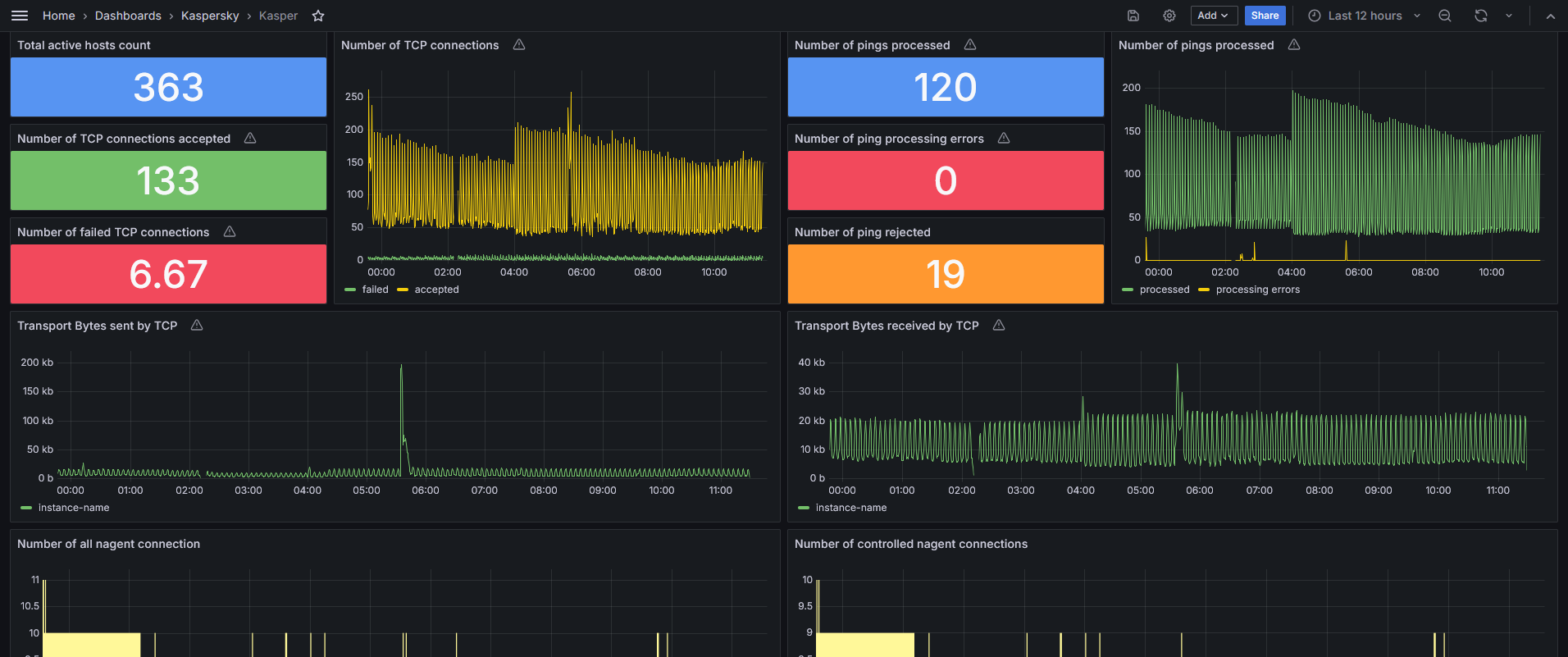 A Grafana dashboard to monitor Kaspersky Security Center metrics exported via Prometheus on port 13296. Provides real-time insights into server health, performance, and security operations.