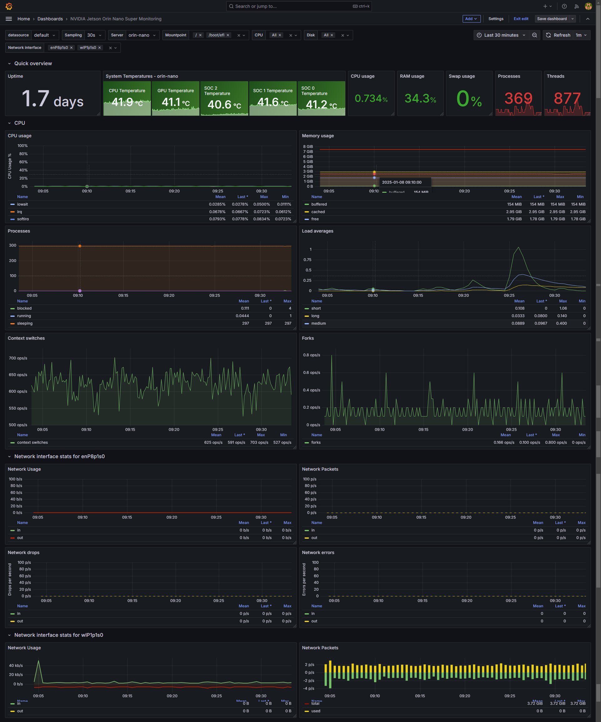 This dashboard contains multiples sections with the goal to monitor a full NVIDIA Jetson Nano Super board or boards, we have some sections to monitor the Linux and machine overall performance, and temperature. Special thanks to Lex Rivera for his Linux System dashboard