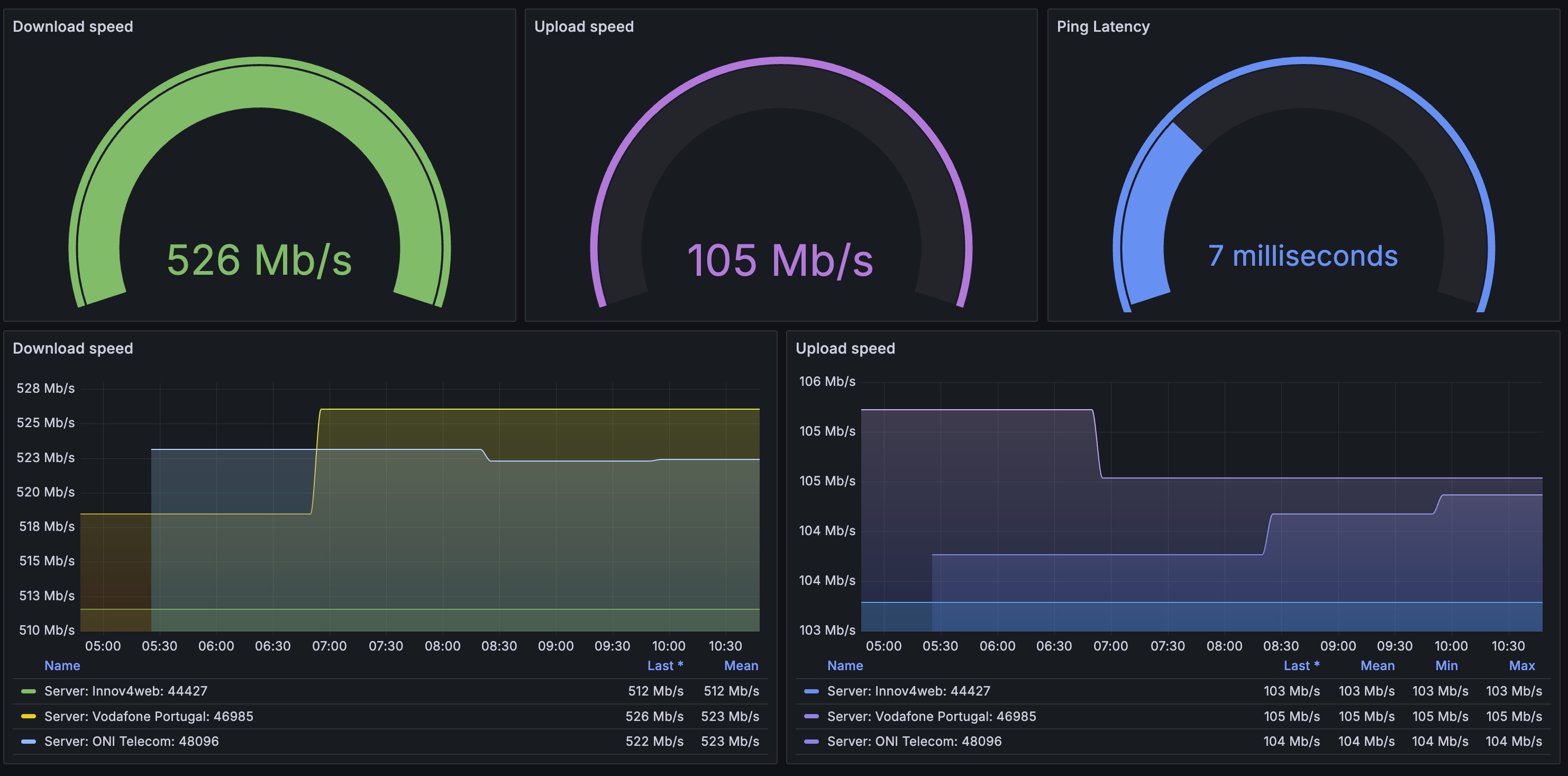 Sample Grafana dashboard for metrics collected by prometheus-speedtest-exporter Source: https://github.com/lpicanco/prometheus-speedtest-exporter