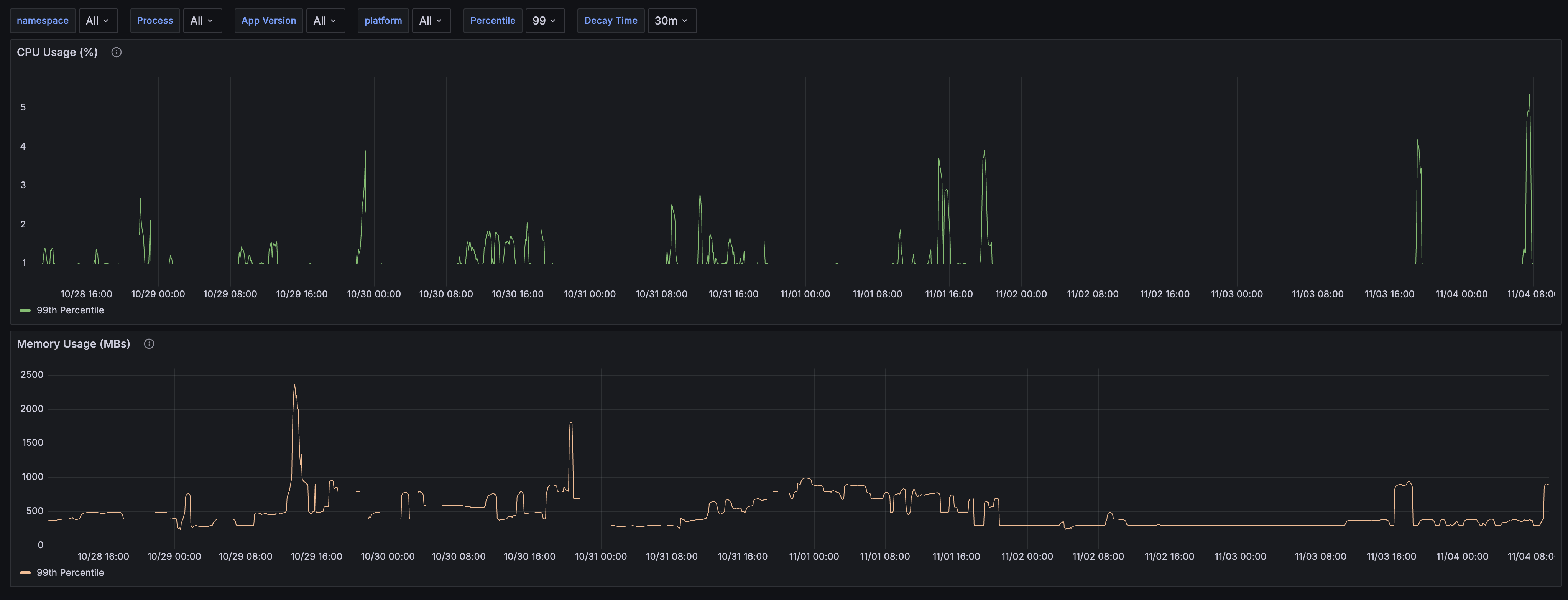 This dashboard displays performance metrics reported by the Mattermost Desktop App. Converse to the Web App Metrics dashboard, this one focuses on hardware usage by showing CPU and memory usage, broken down by individual process created by the Mattermost Desktop App. The dashboard allows filtering by Mattermost Desktop App version and operating system.