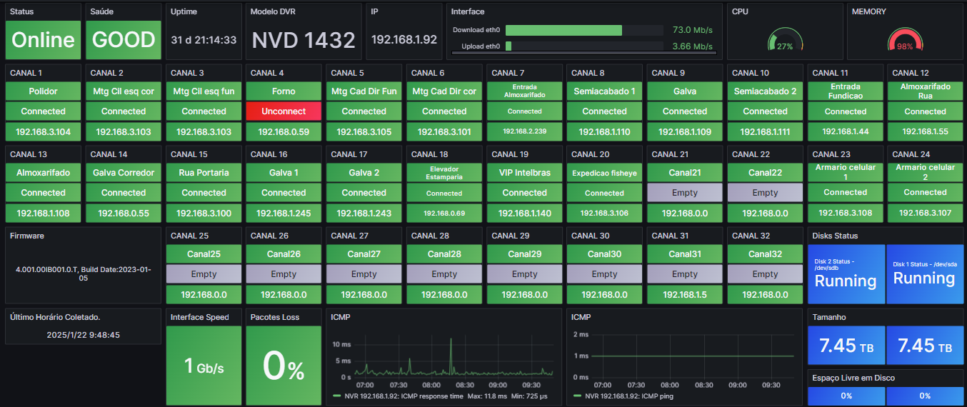 The NVR NVD 1432 dashboard uses the alexanderzobnin-zabbix-datasource data source to create a Grafana dashboard with the bargauge, gauge, stat and timeseries panels.