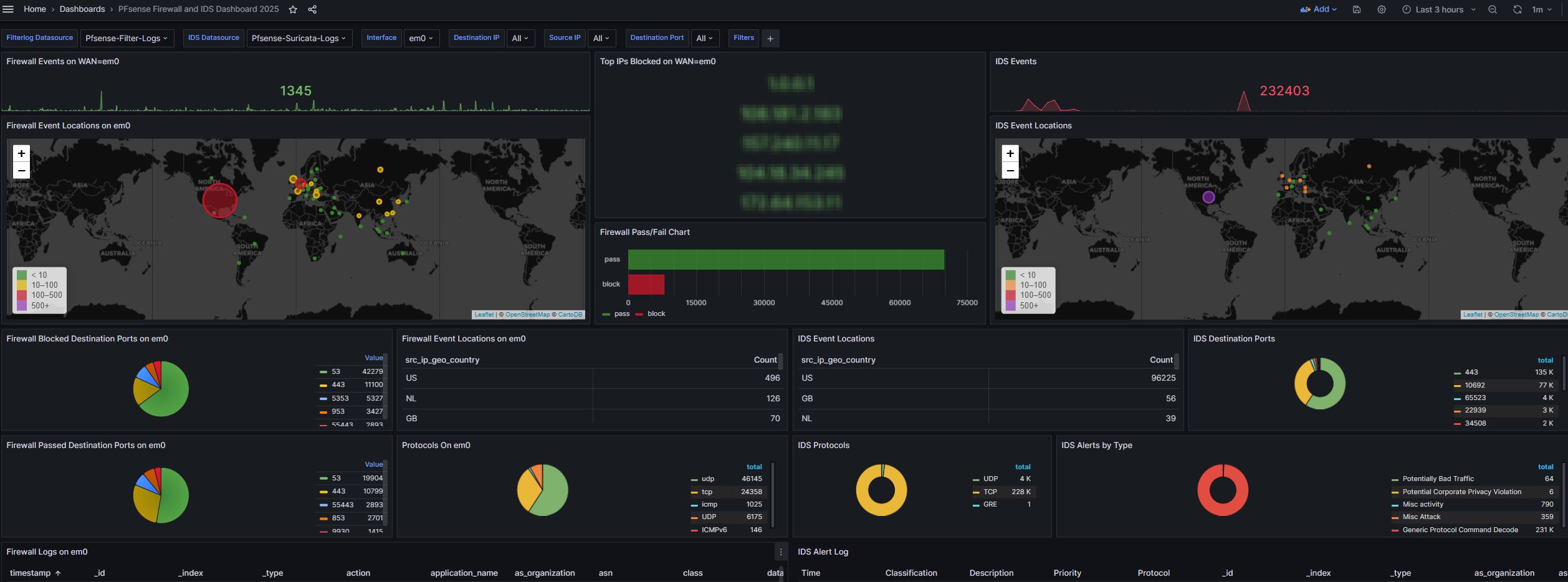 This dashboard is designed to work with PFSense firewall and Suricata IDS Events pulled from Graylog.