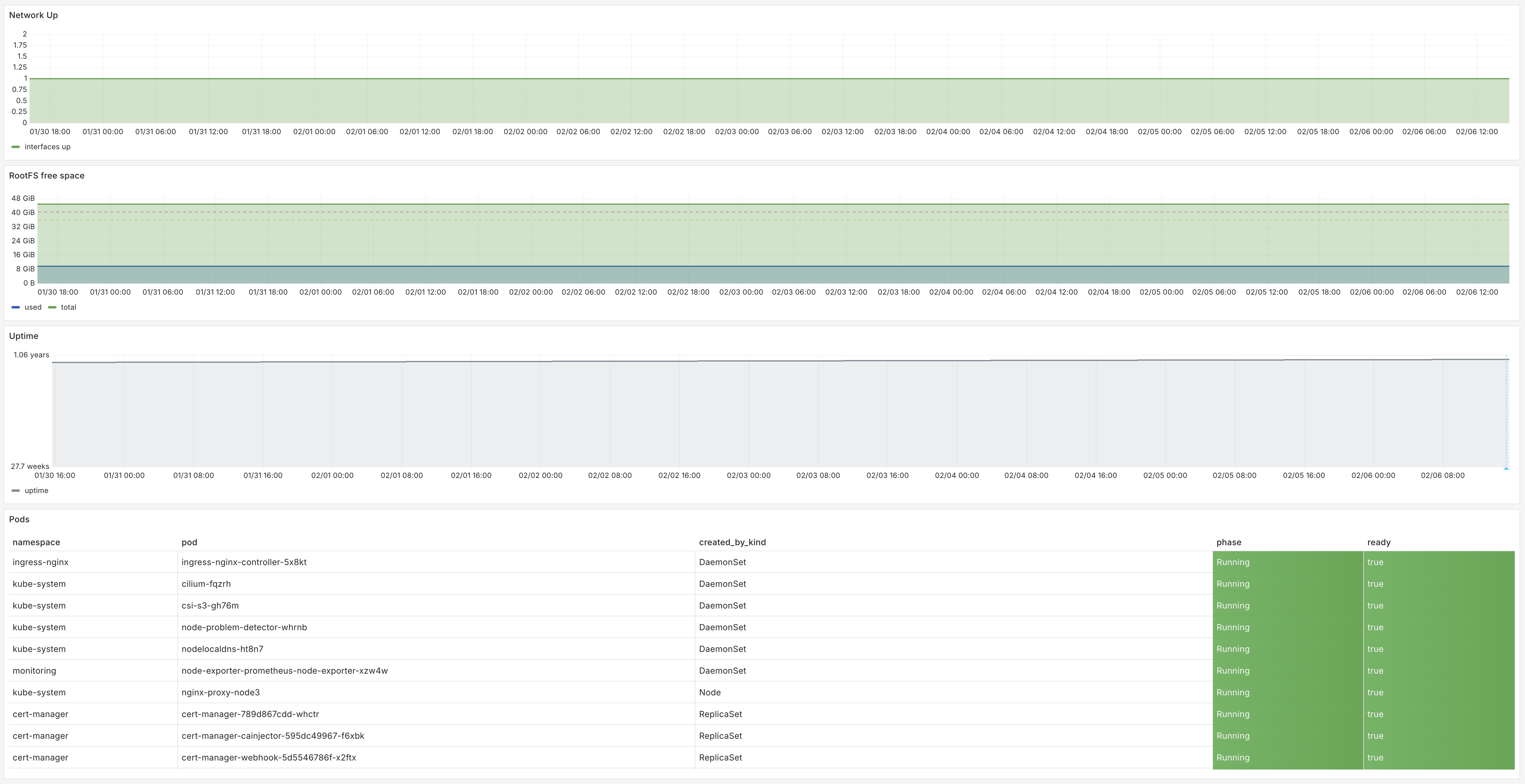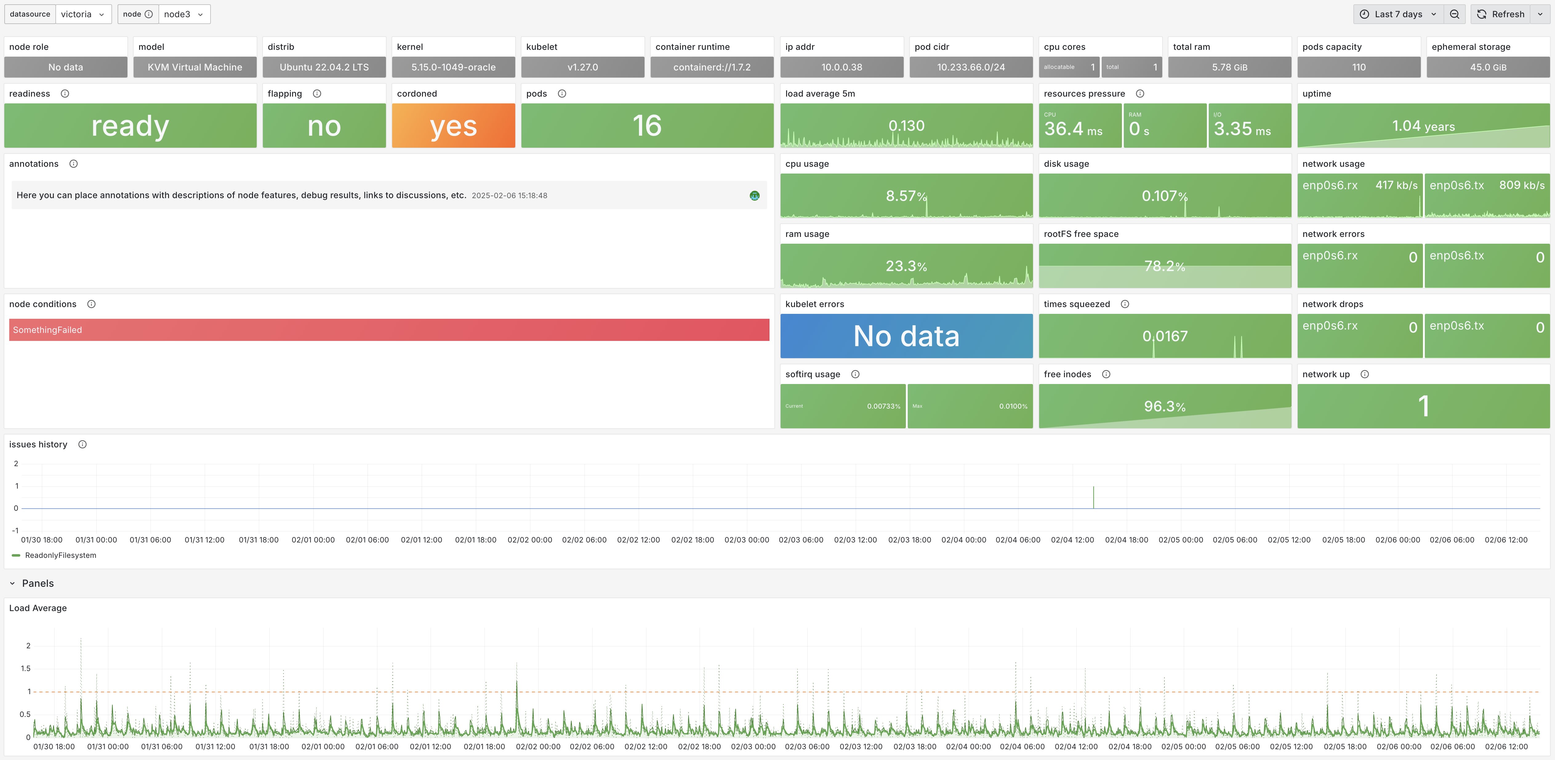 Node Status is designed for quick diagnostics of a node in a Kubernetes cluster. It compactly displays all the main information about it. Clicking on the small panels opens detailed information on the relevant topic.