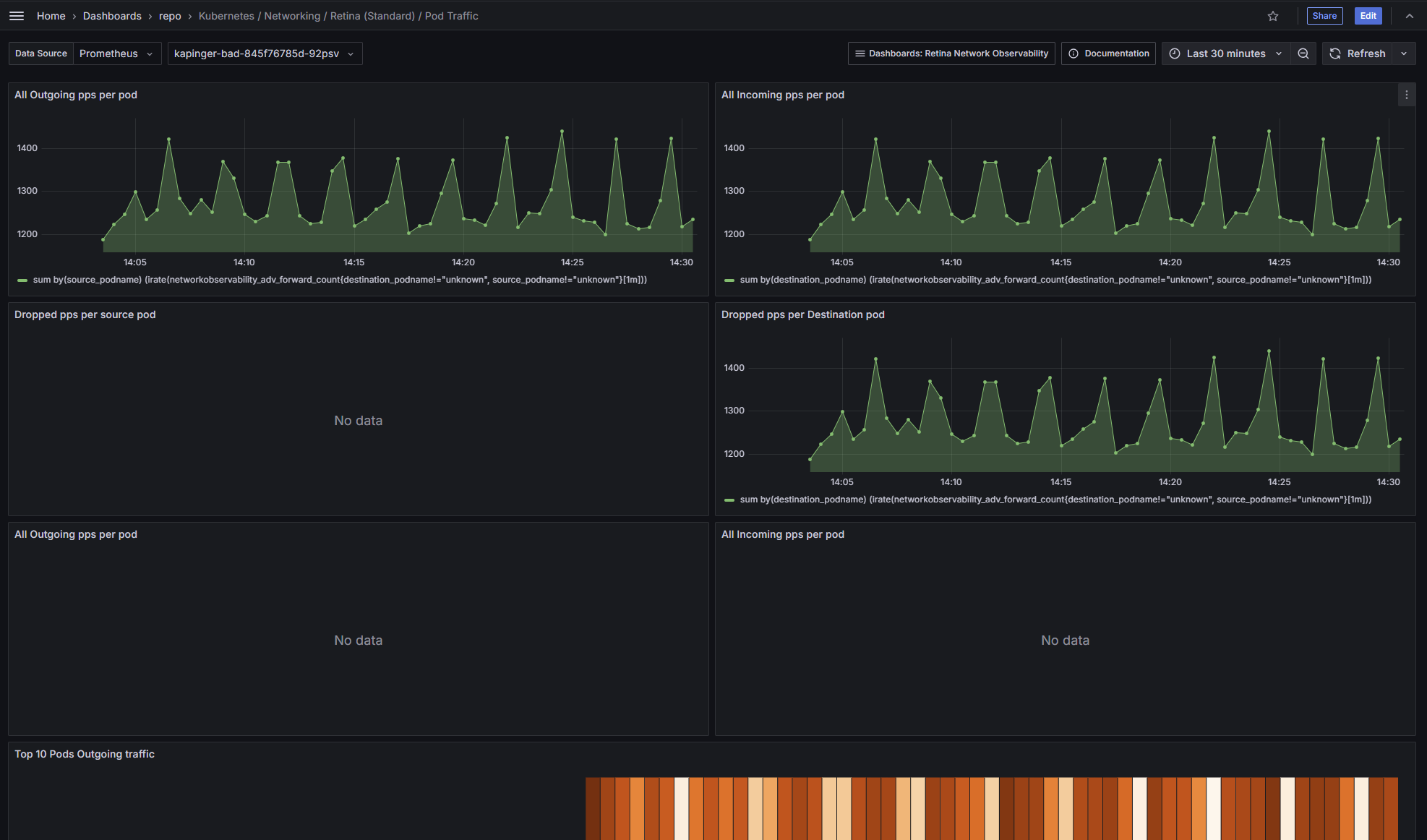 Retina Network Observability visualize metrics for any Kubernetes cluster using [Retina](https://retina.sh/) (any cloud provider, any CNI, any OS). This dashboard provides pod-level metrics.