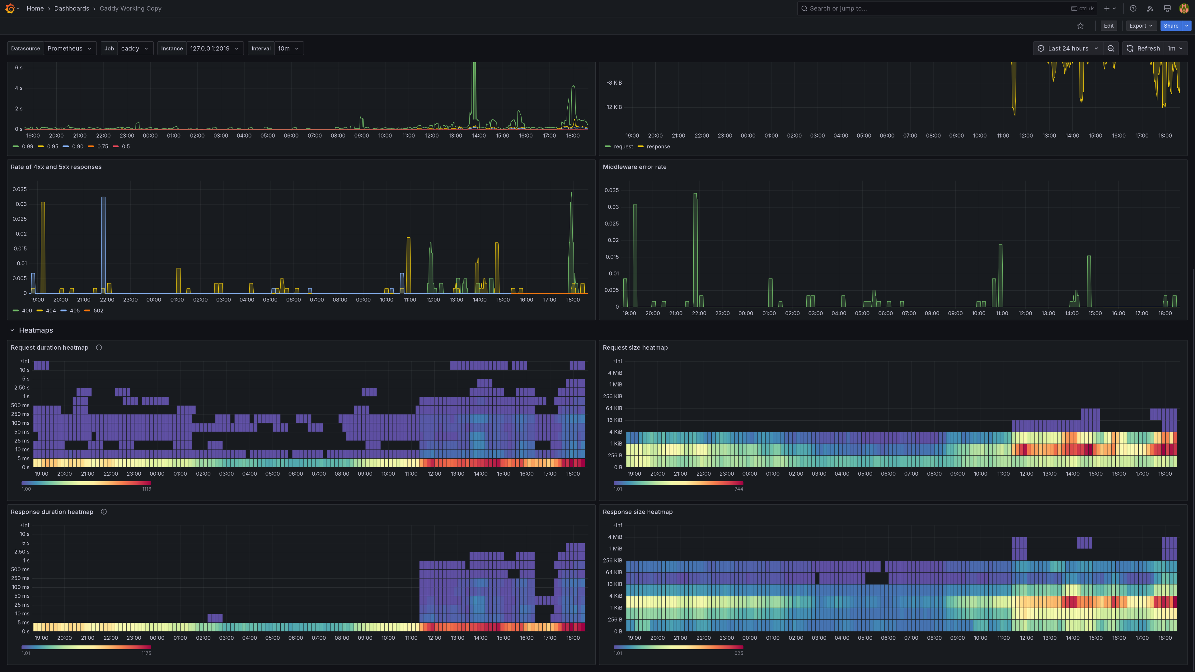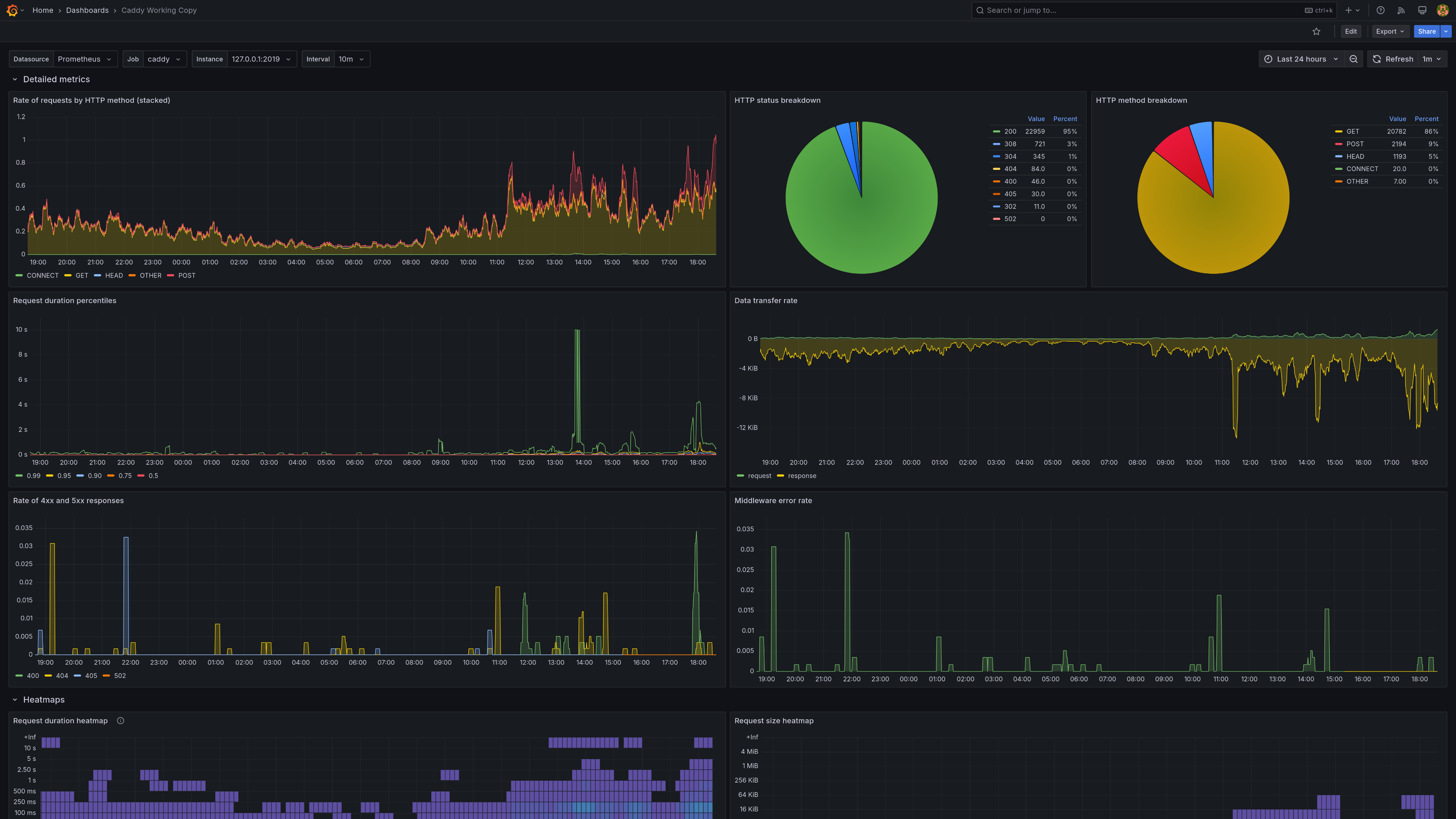 The Caddy dashboard uses the prometheus data source to create a Grafana dashboard with the heatmap, piechart, stat and timeseries panels.