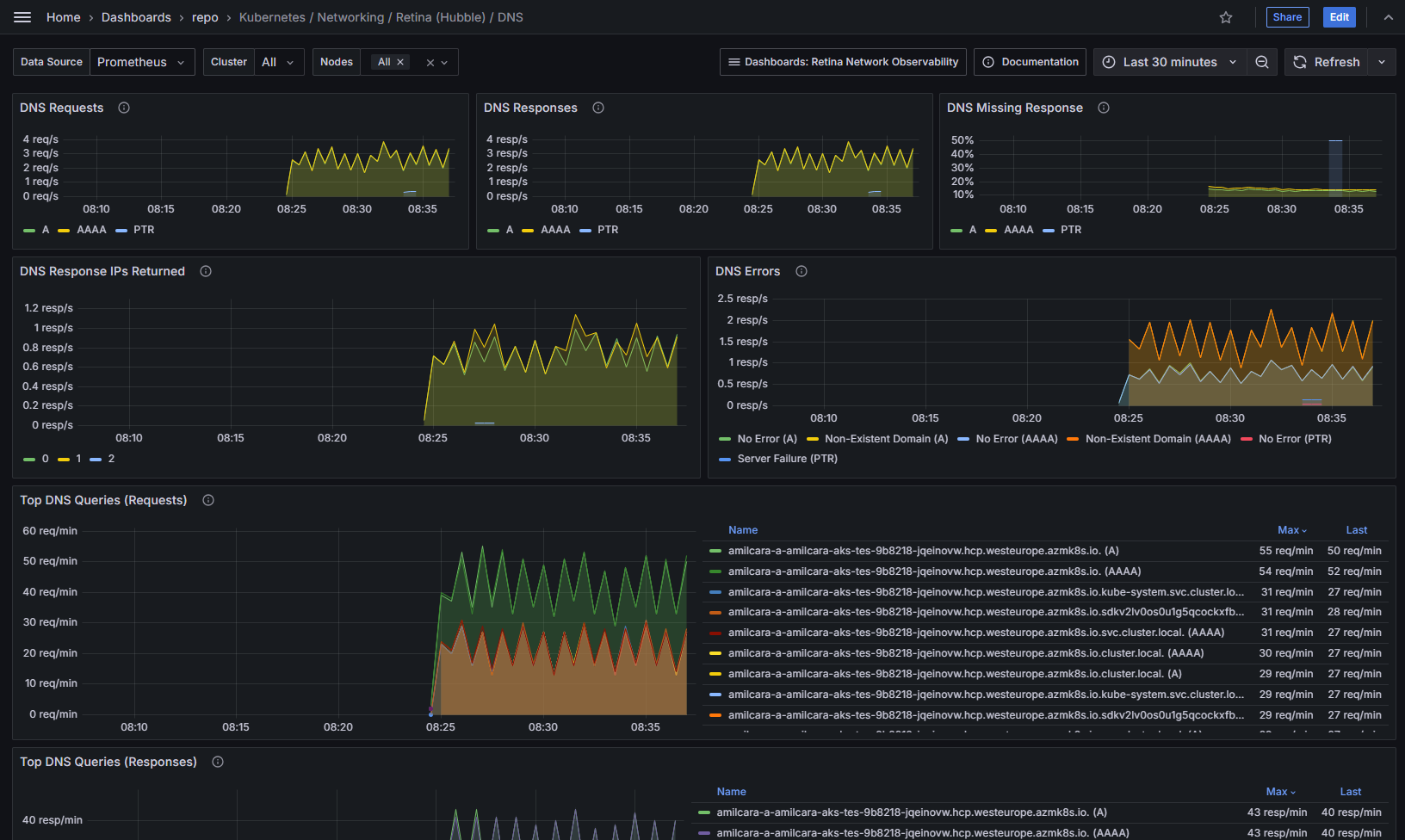Retina Network Observability visualize metrics for any Kubernetes cluster using [Retina](https://retina.sh/) (any cloud provider, any CNI, any OS). This dashboard provides DNS metrics for Hubble Control Plane Retina deployments.