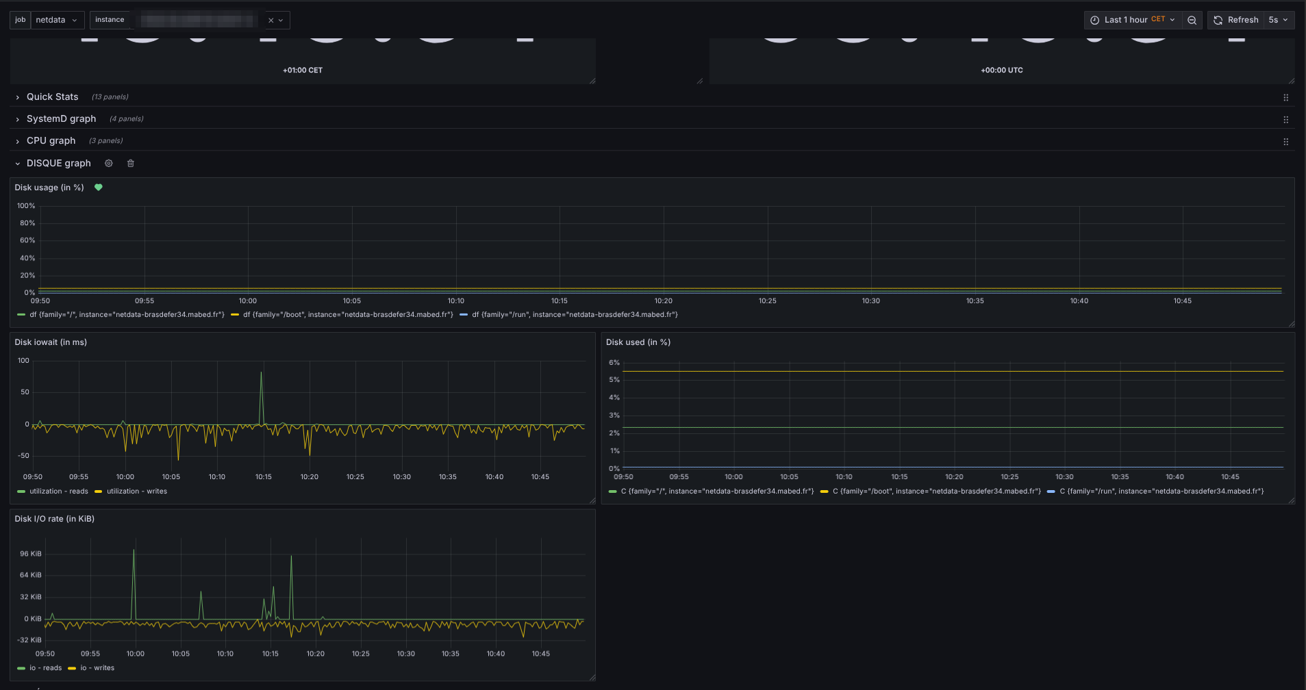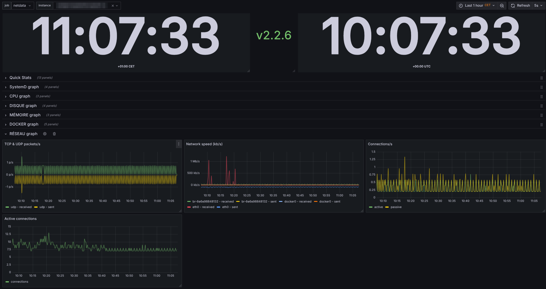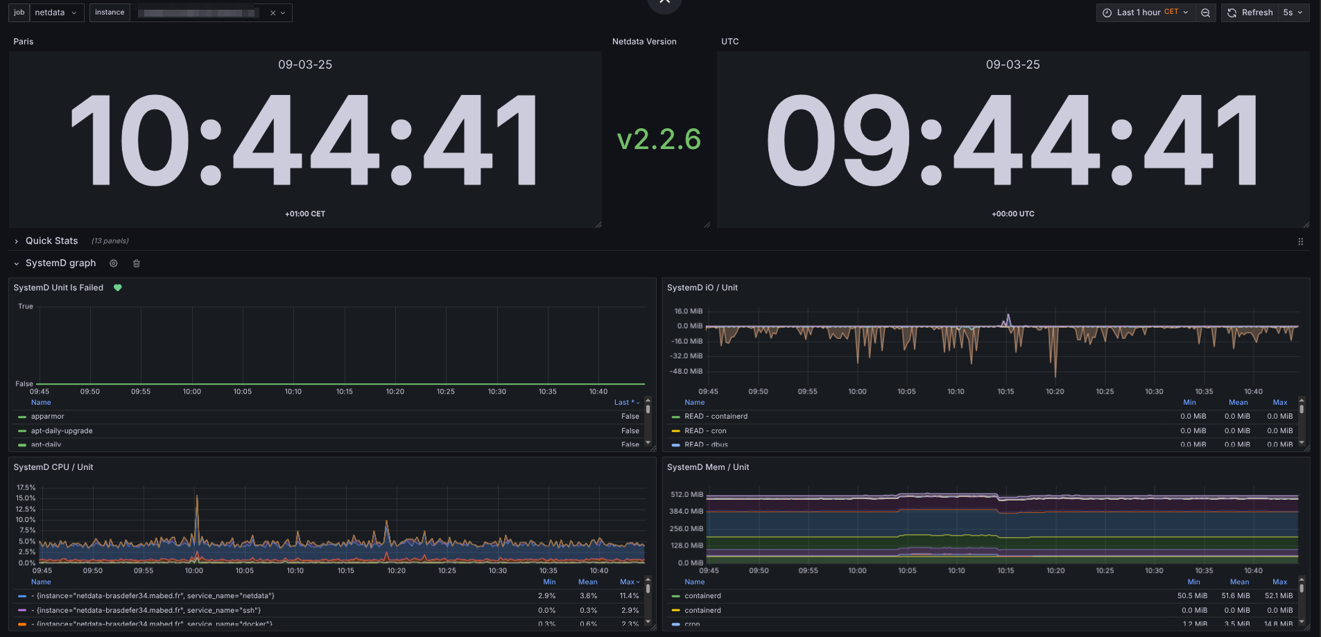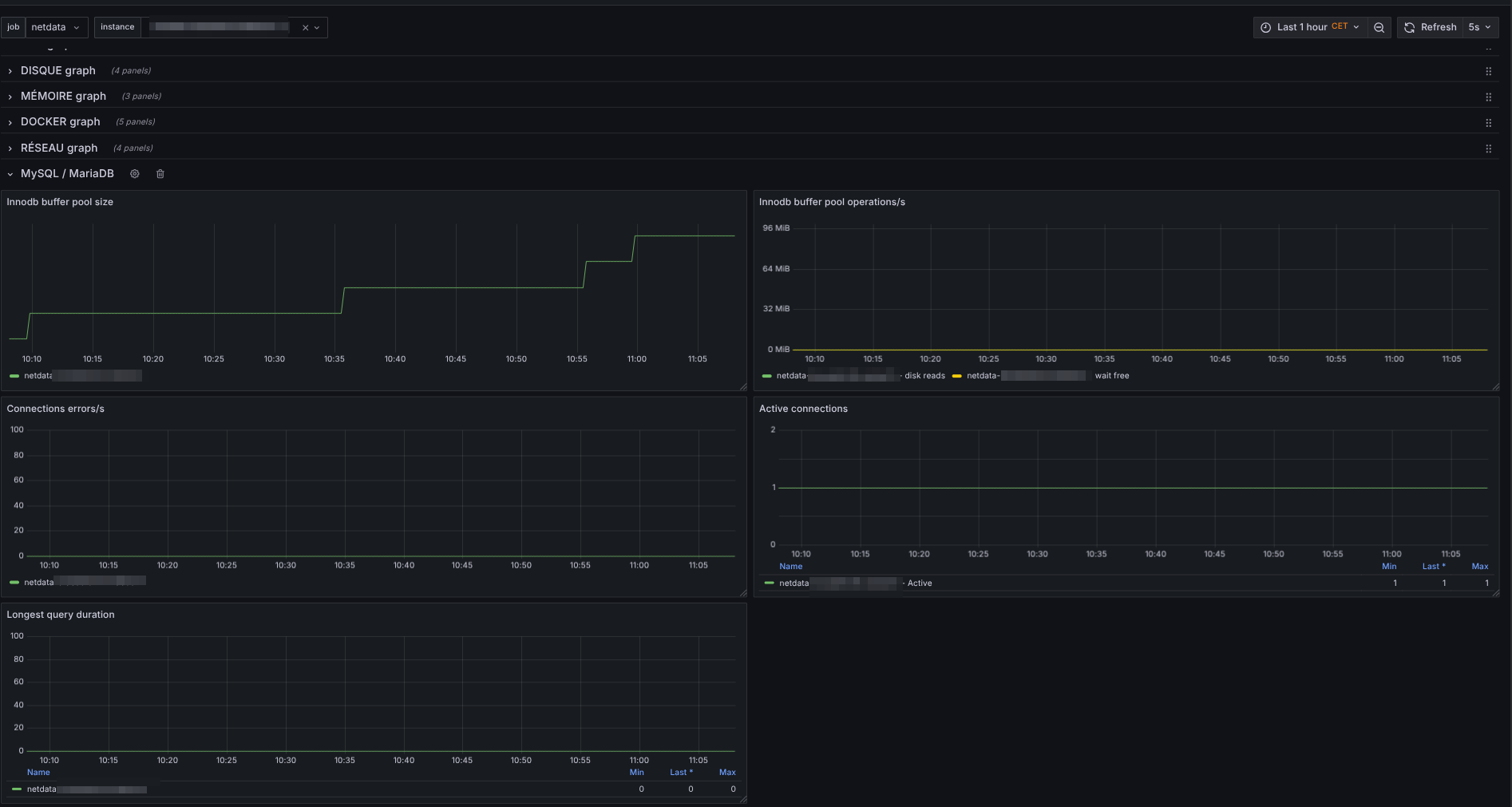 Netdata up to 2.2.6 Prometheus 3.2.1 Grafana 11.5.2 My prom configuration - job_name: 'netdata' scrape_interval: 5s metrics_path: '/api/v1/allmetrics?format=prometheus&variables=yes' scheme: http static_configs: - targets: - 'netdata-xxxxx.exemple.fr' - 'netdata-yyyyy.exemple.fr' - 'netdata-zzzzz.exemple.fr'