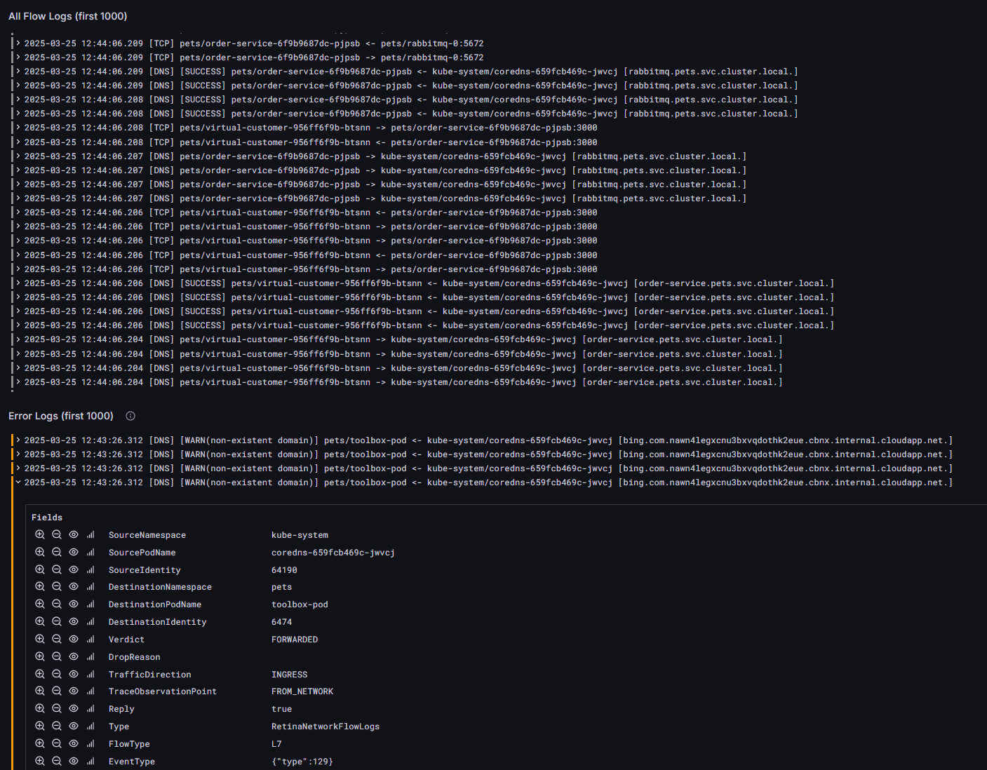 The service graph displays the cluster's network topology, surfacing drops and errors. A view for raw flow logs provides detailed info and timestamps.