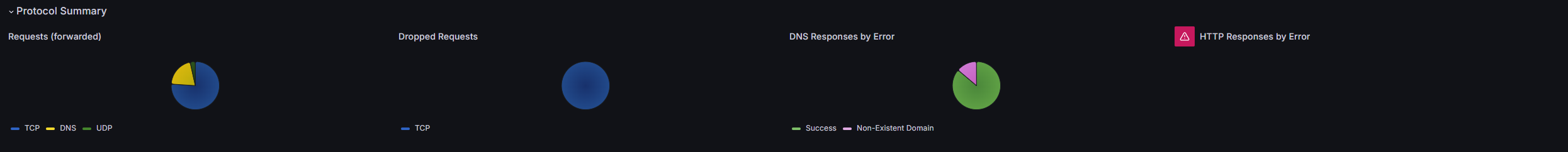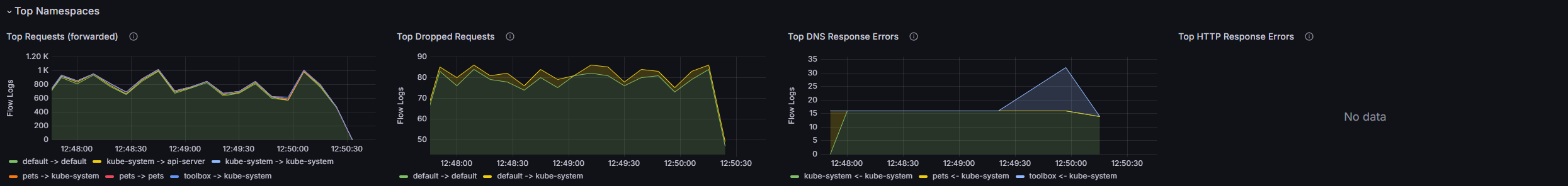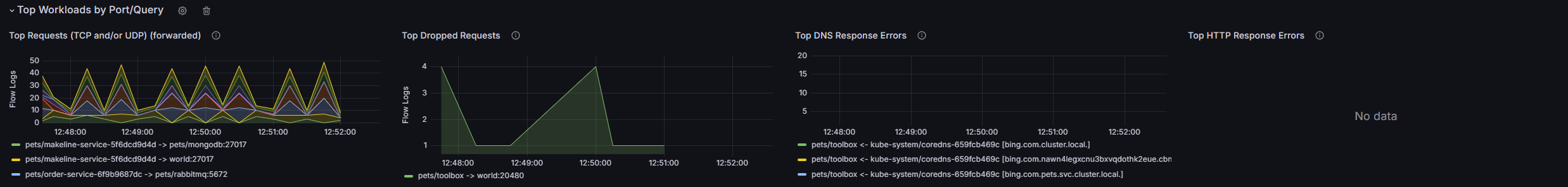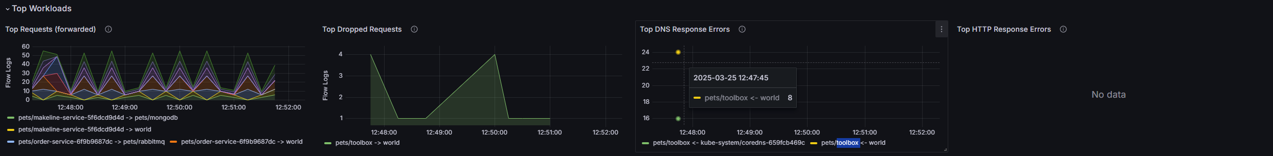 This dashboard provides visualizations into which Kubernetes workloads are communicating with each other, including network requests, responses, drops, and errors.