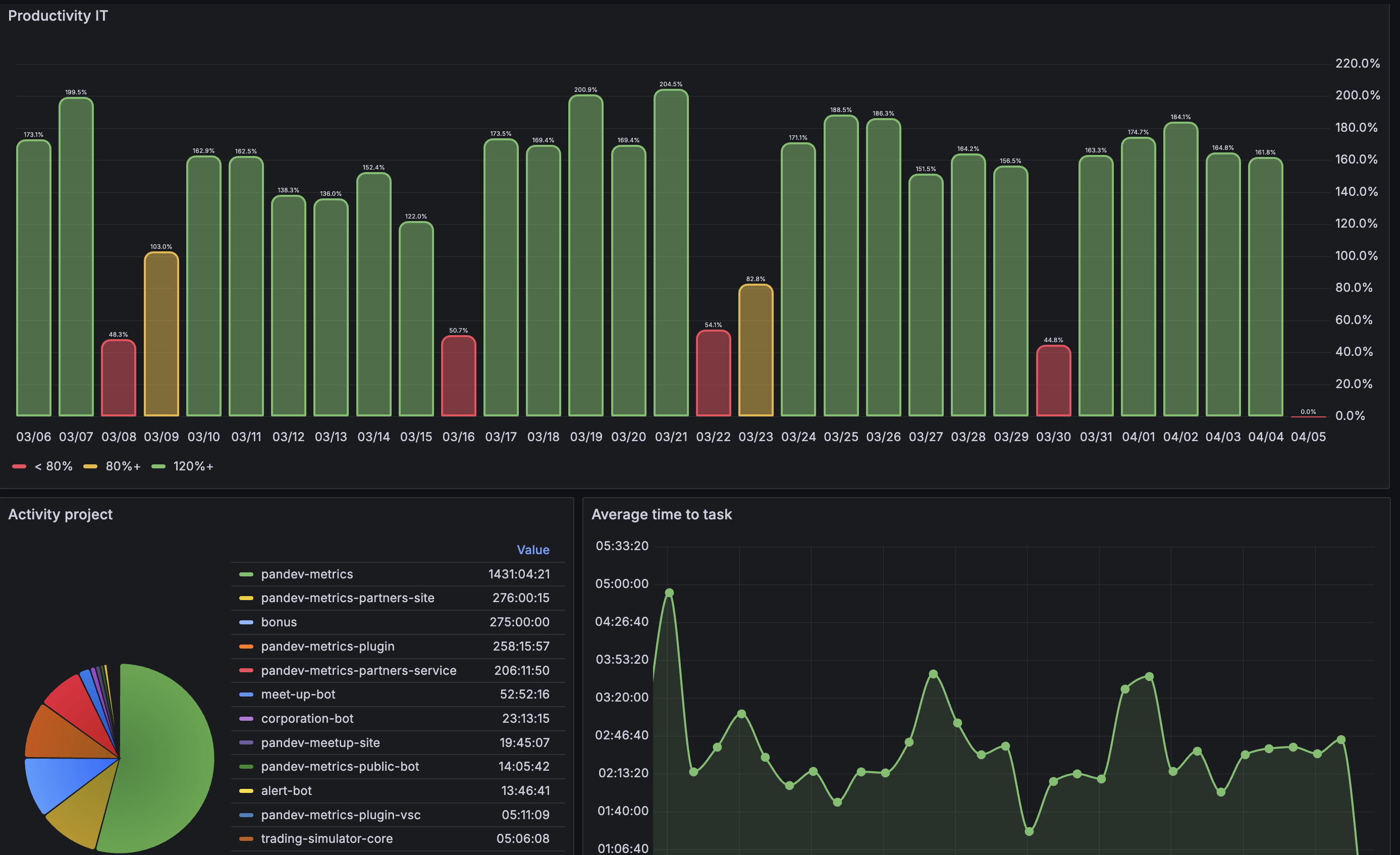 The PanDev CEO Dashboard dashboard uses the grafana-postgresql-datasource data source to create a Grafana dashboard with the barchart, piechart and timeseries panels.