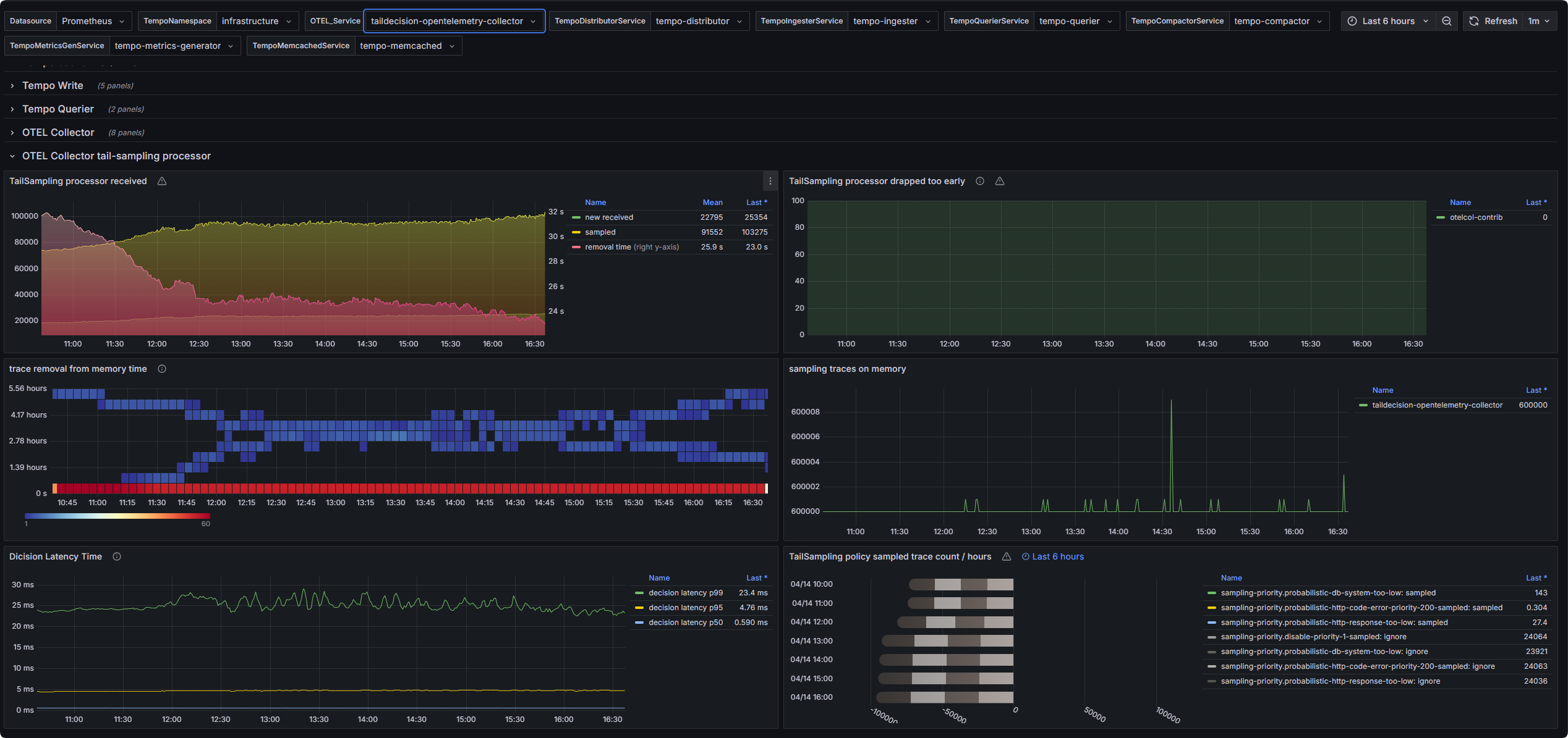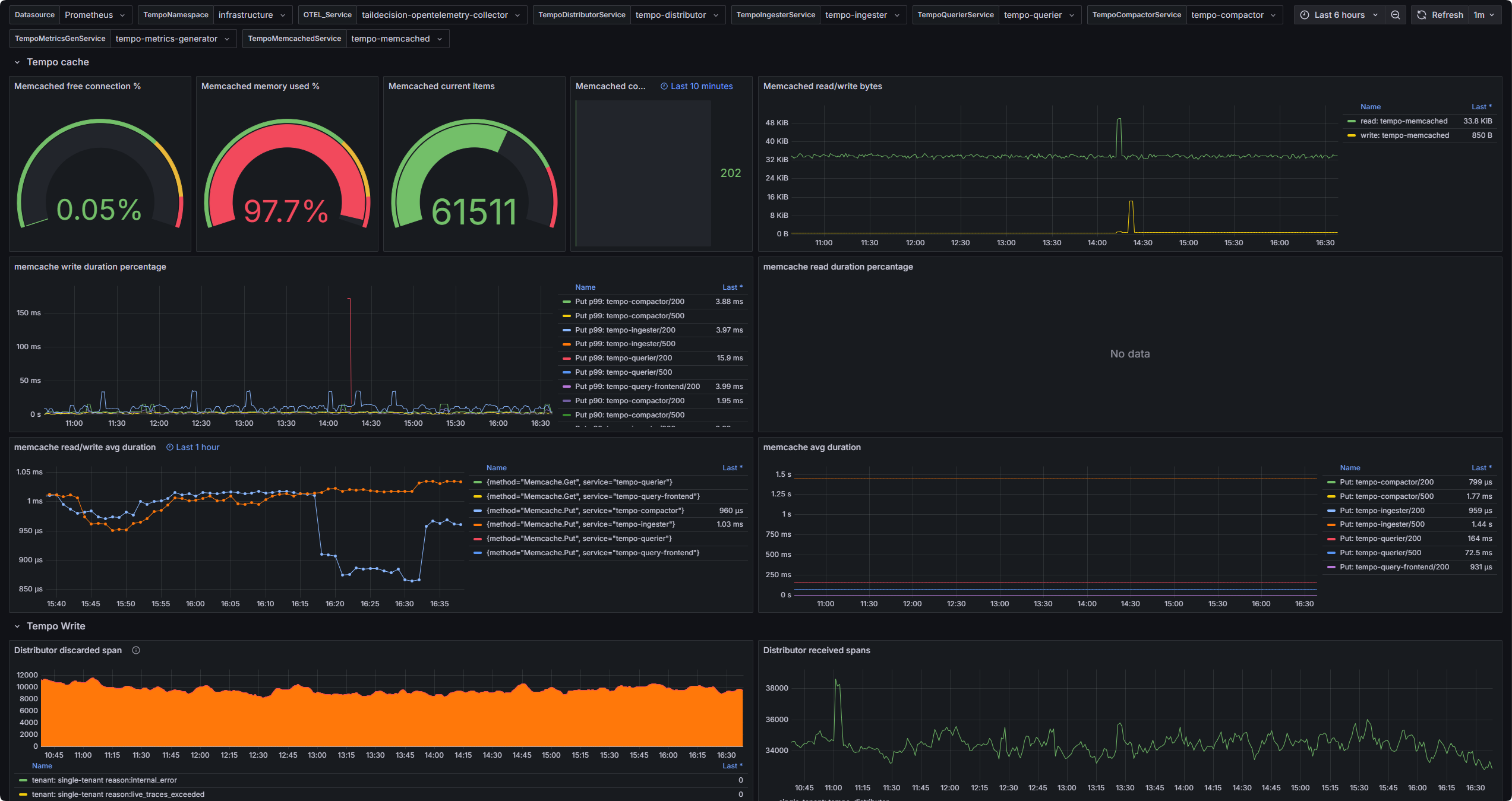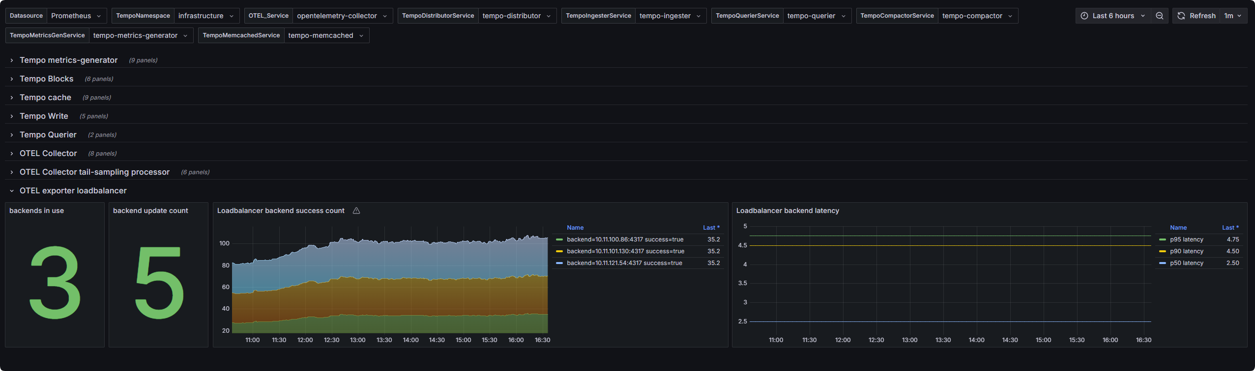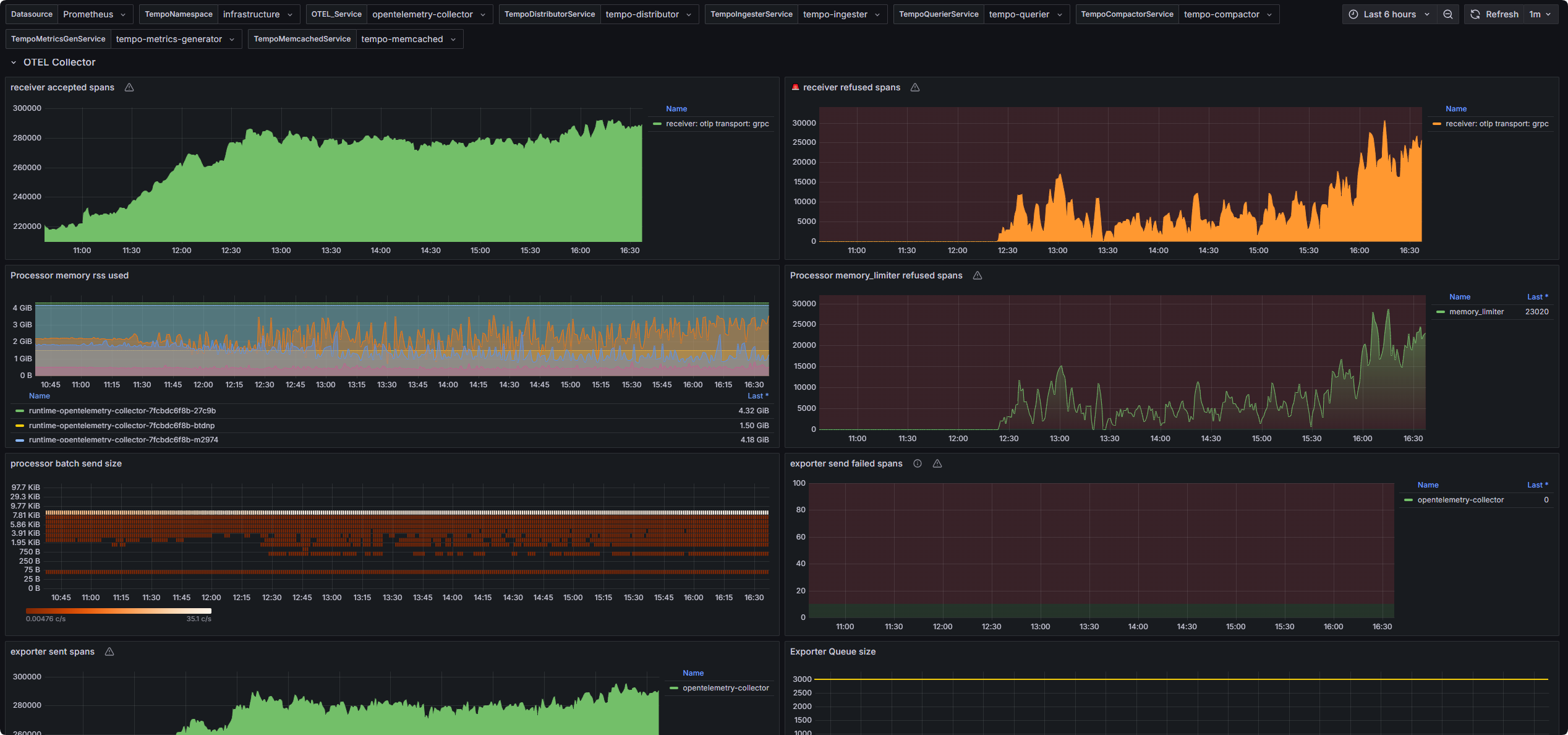This dashboard provides comprehensive observability into the performance and health of key components within an OpenTelemetry and Tempo tracing pipeline.