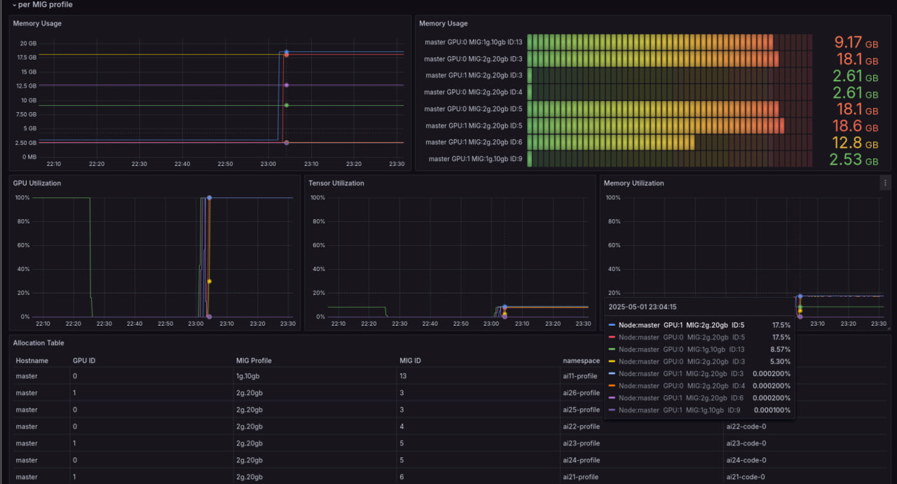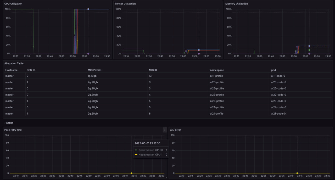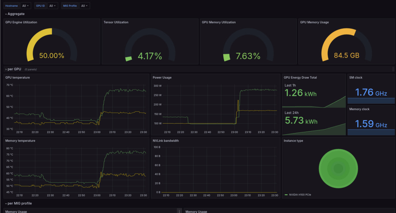 This Grafana dashboard uses the NVIDIA DCGM exporter to monitor GPU performance in Kubernetes clusters. Supporting both MIG and non-MIG GPUs, it provides real-time metrics on utilization, memory, temperature, power, and more, enabling efficient management of NVIDIA GPU resources.