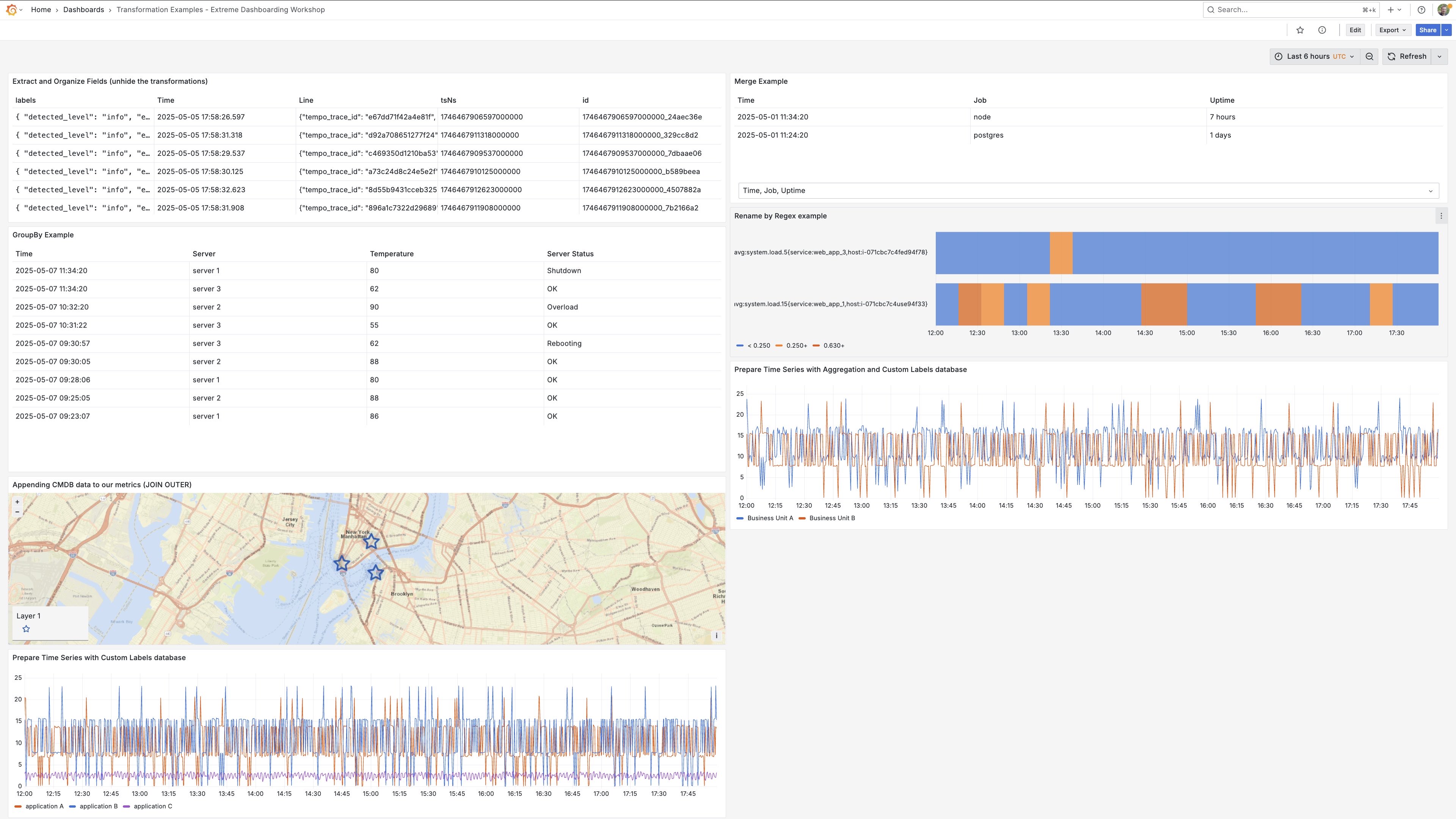 This dashboard reviews a small set of transform functions within Grafana, including merge, extract fields, organize fields, groupBy, join, prepare time series, and rename by regex. Documentation for these capabilities are here: https://grafana.com/docs/grafana/latest/panels-visualizations/query-transform-data/