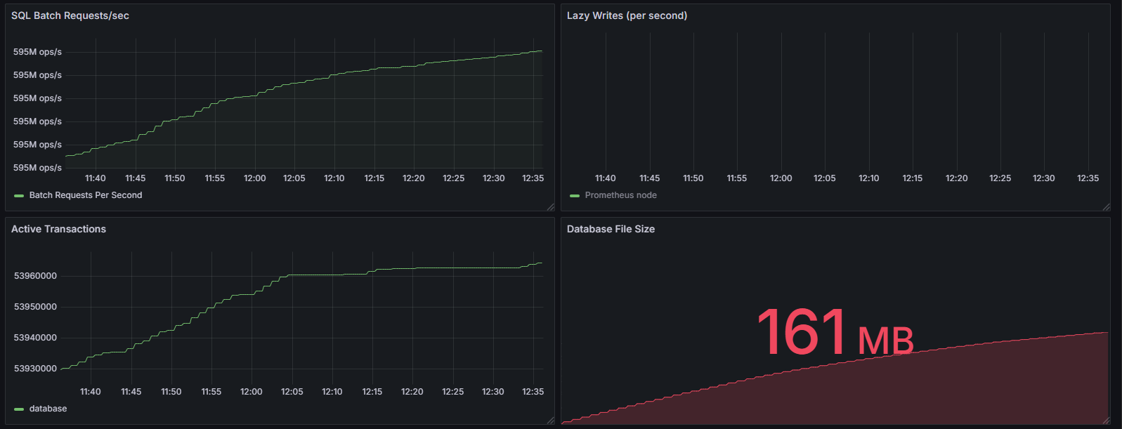 The metrics are collected using the Prometheus MSSQL Exporter, which exposes SQL Server internals via a /metrics endpoint that Prometheus scrapes at regular intervals.