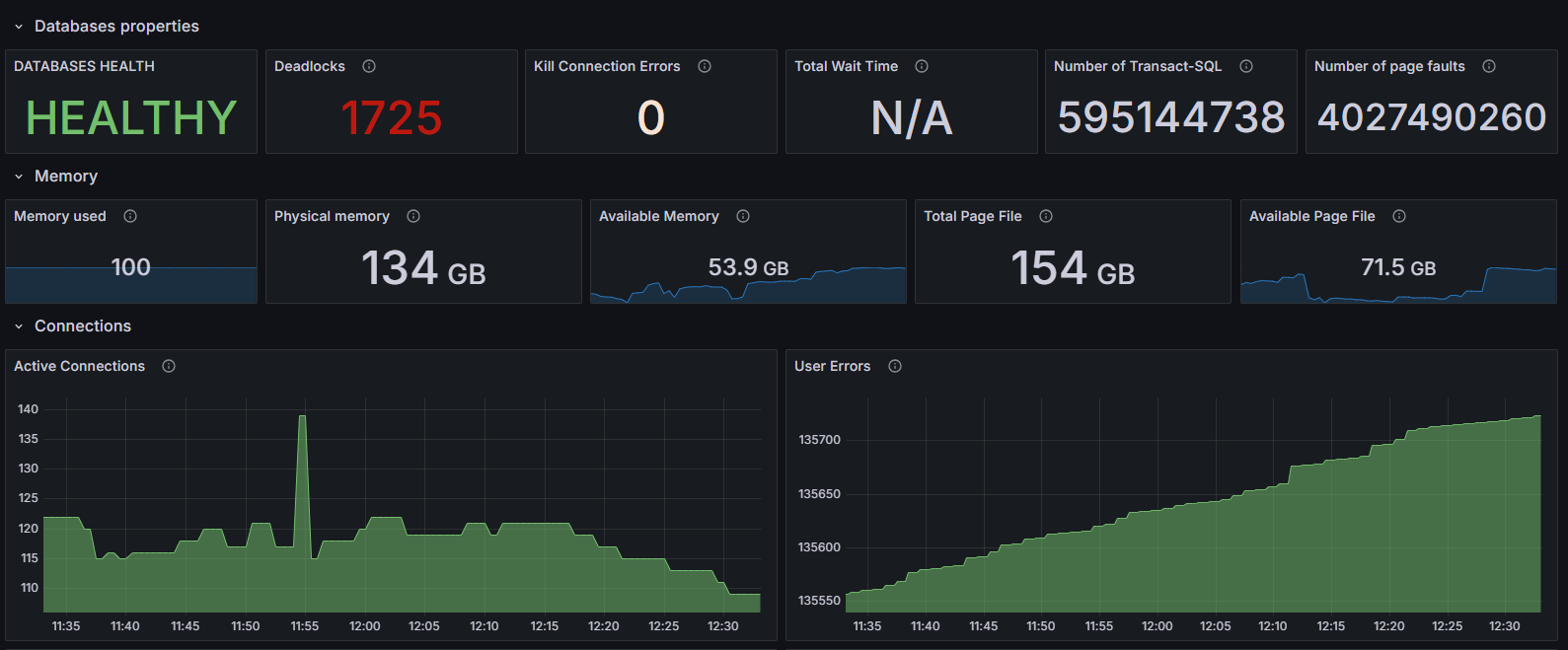 This dashboard provides a comprehensive overview of Microsoft SQL Server (MSSQL) performance metrics. It is designed to help database administrators and DevOps engineers monitor the health, performance, and resource usage of SQL Server instances in real-time.