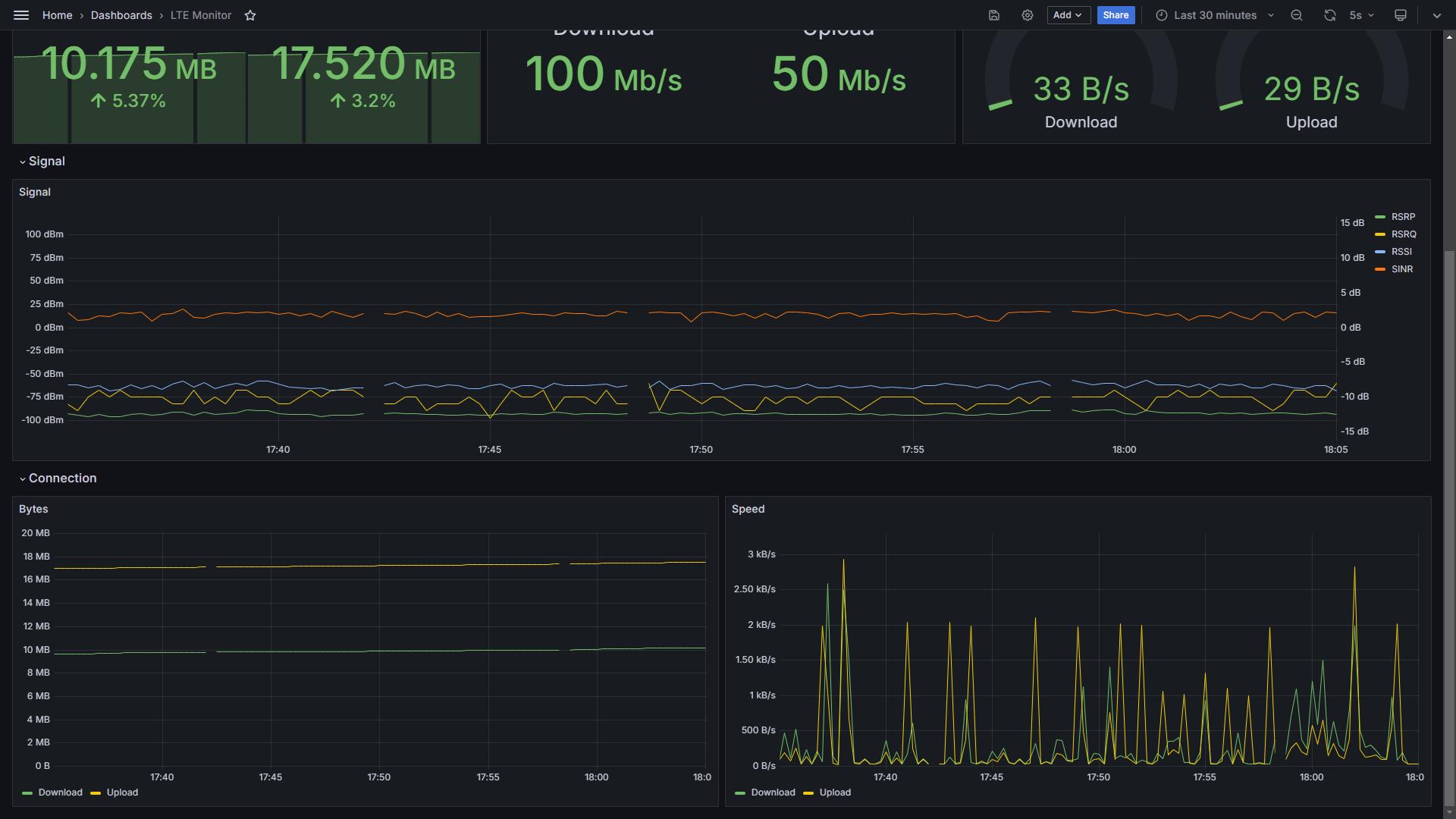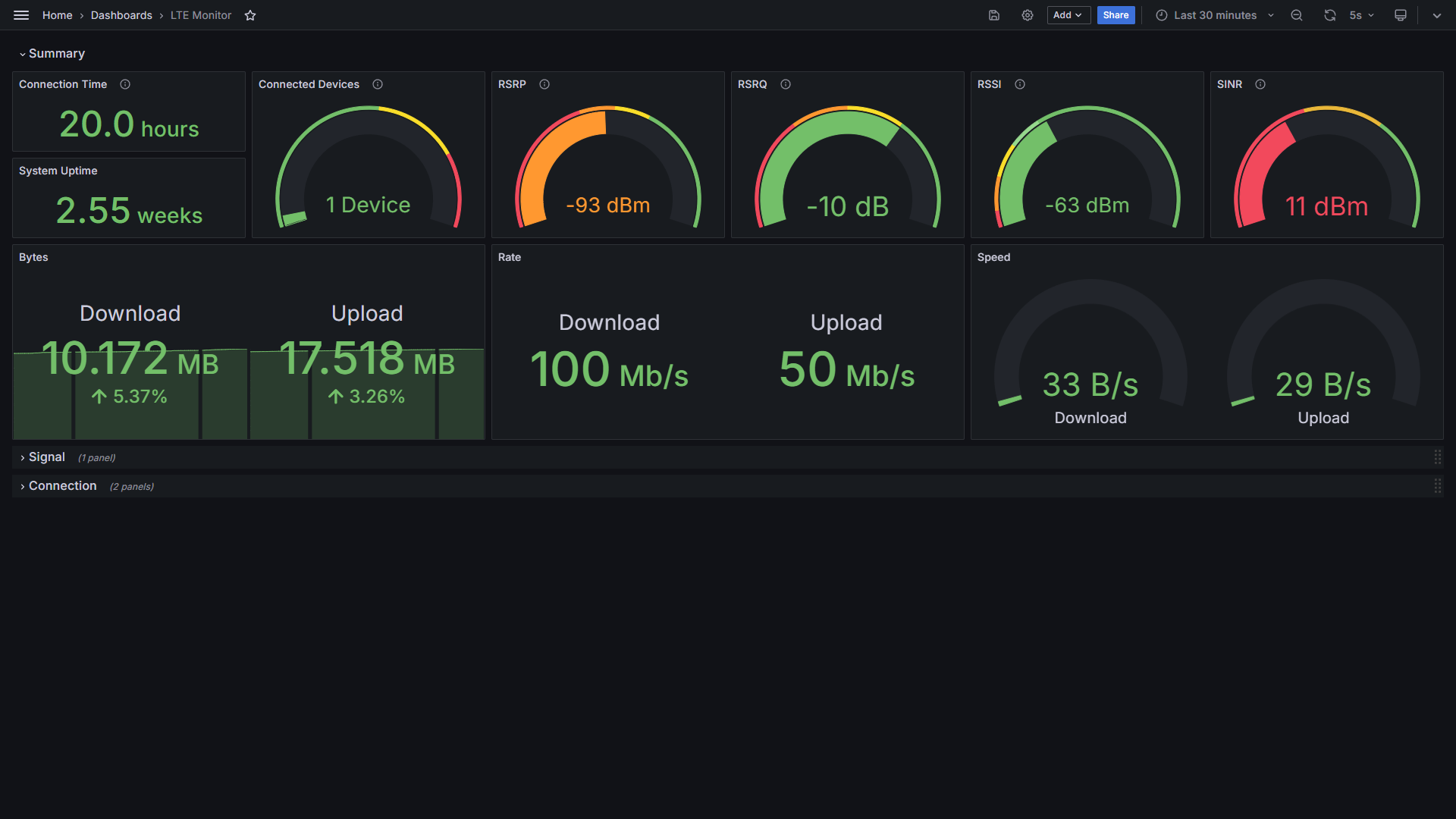 Dashboard for the software to monitor the status of a LinkHub LTE modem via Prometheus and Grafana. See: https://github.com/SimonPrinz/LTEMonitor