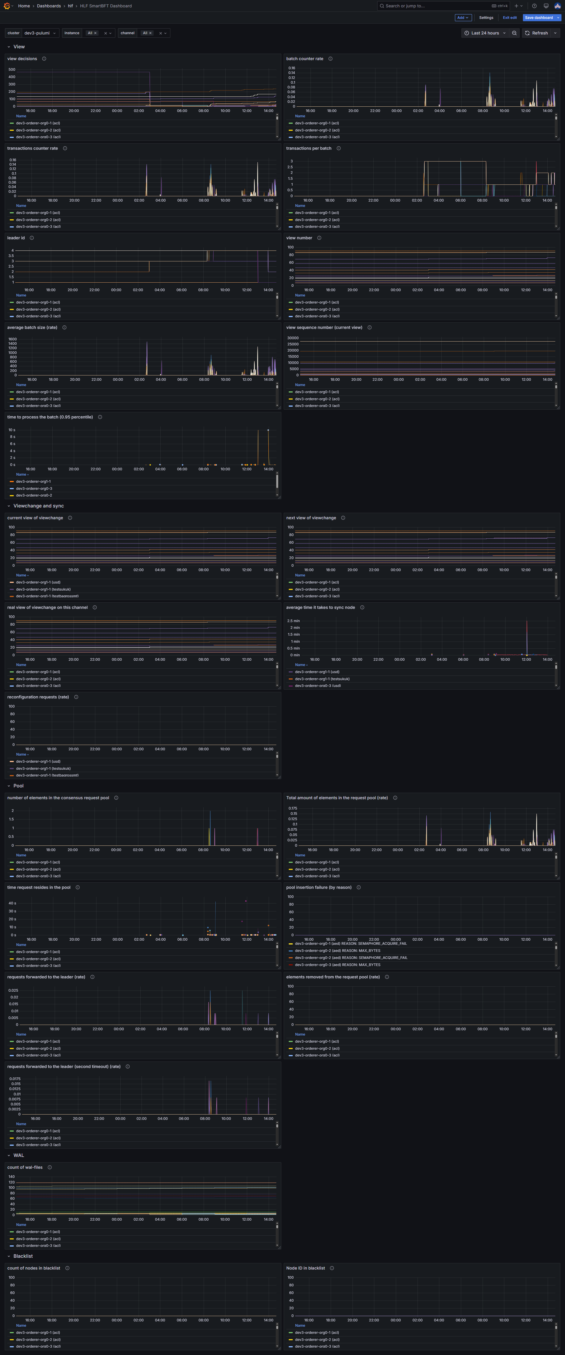 Comprehensive monitoring dashboard for Hyperledger Fabric networks using SmartBFT consensus algorithm. Tracks view changes, transaction processing, batch metrics, and pool performance.