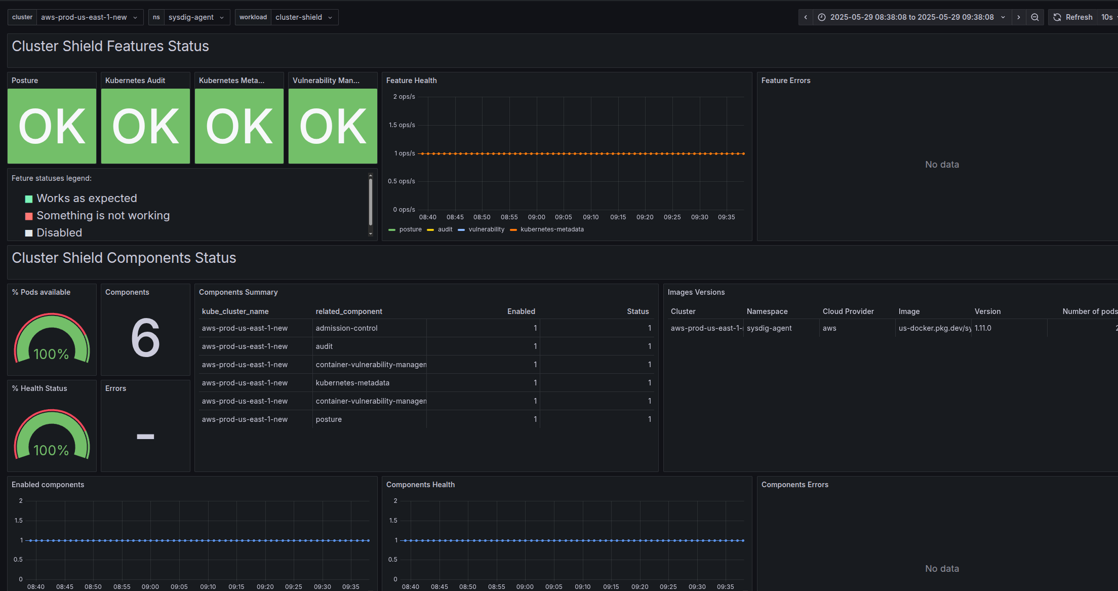 Sysdig Shield provides runtime detection and policy enforcement for Kubernetes workloads by leveraging Falco to enhance security and compliance. The Cluster Shield collects data from the Kubernetes nodes where it is installed, sending it to the Sysdig backend while synchronizing runtime policies and rules.