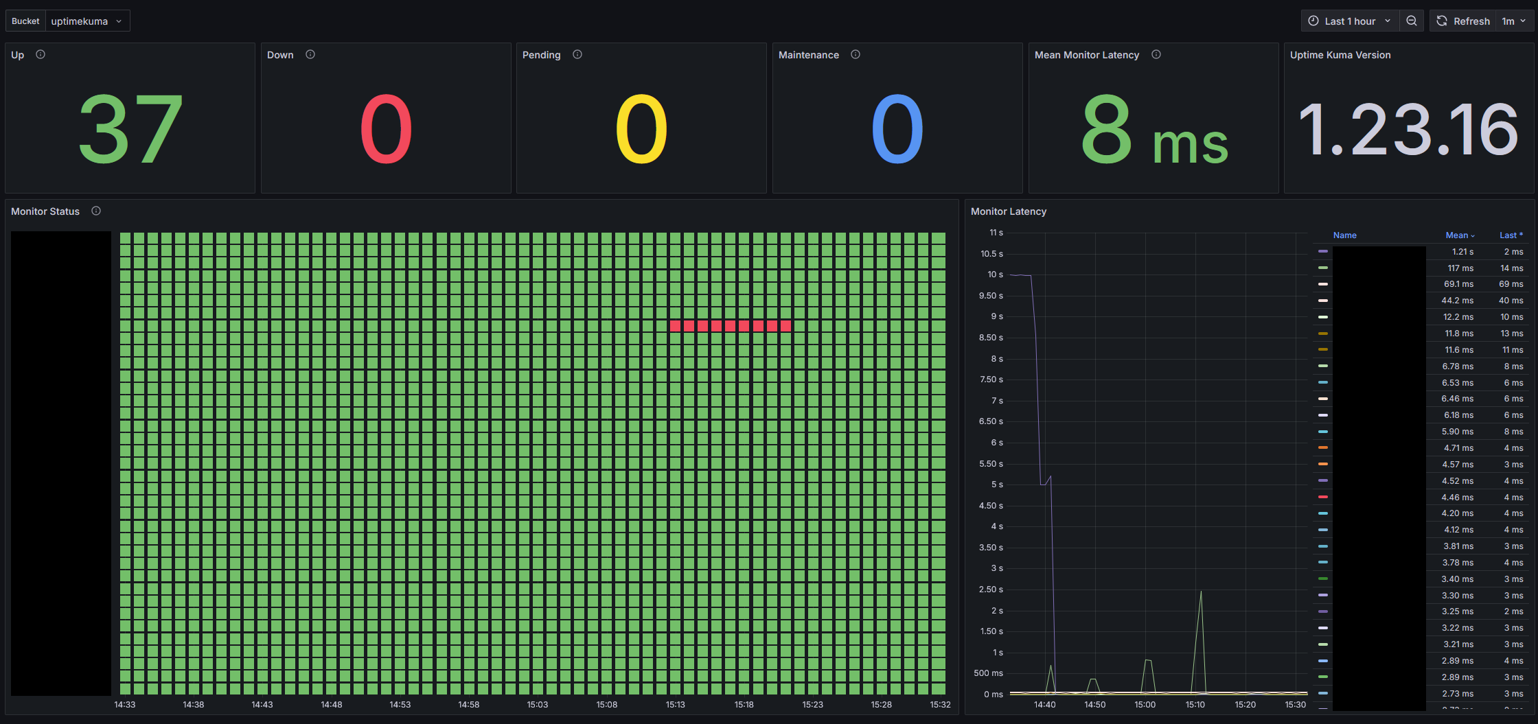 Monitor all of your Uptime Kuma status information within an easily digestible Grafana Dashboard!