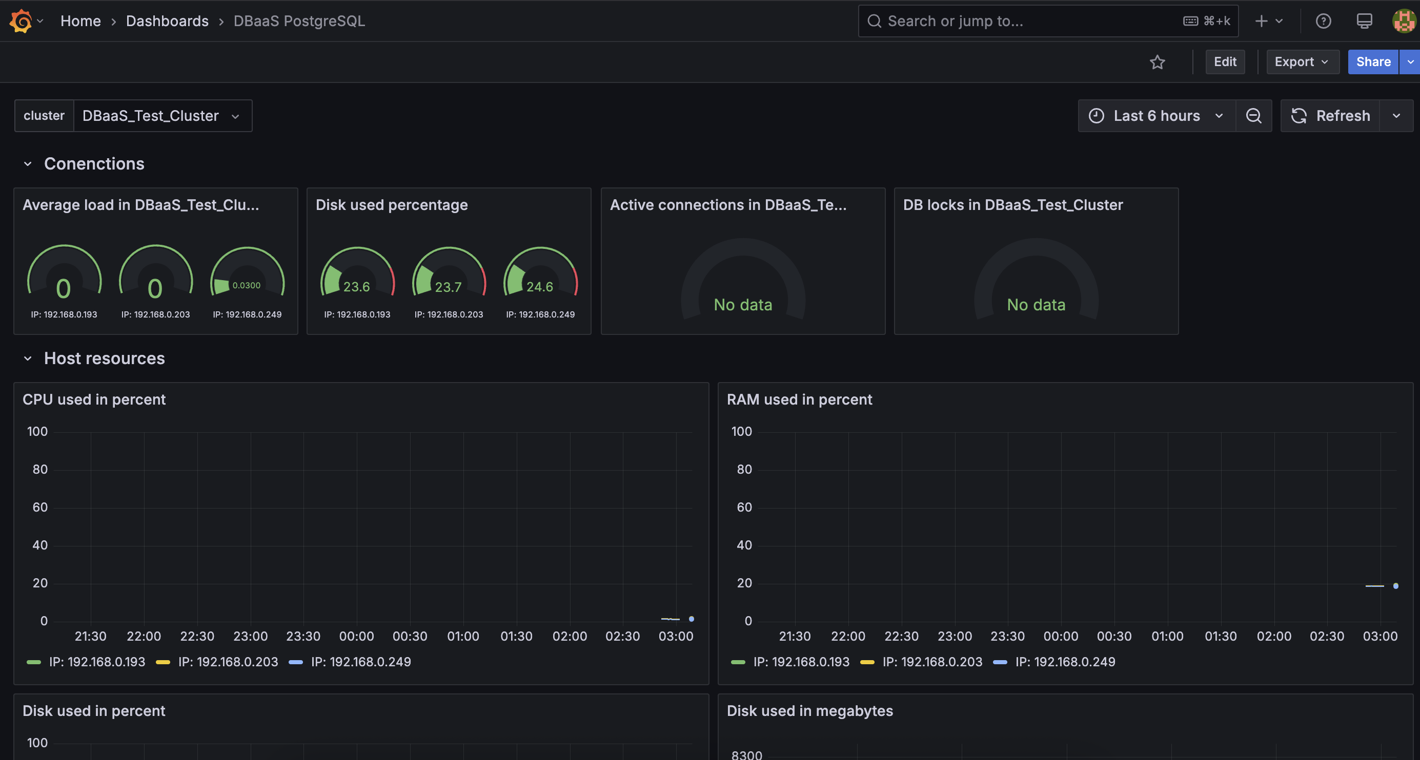 The Selectel DBaaS PostgreSQL dashboard uses the prometheus data source to create a Grafana dashboard with the gauge and timeseries panels.