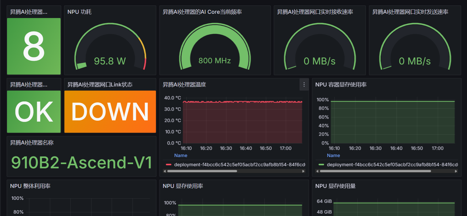 此仪表板显示通过添加到 Prometheus 的指标端点从npu-exporter收集的 NPU 指标。单独的端点已通过服务监视器添加到 Prometheus。