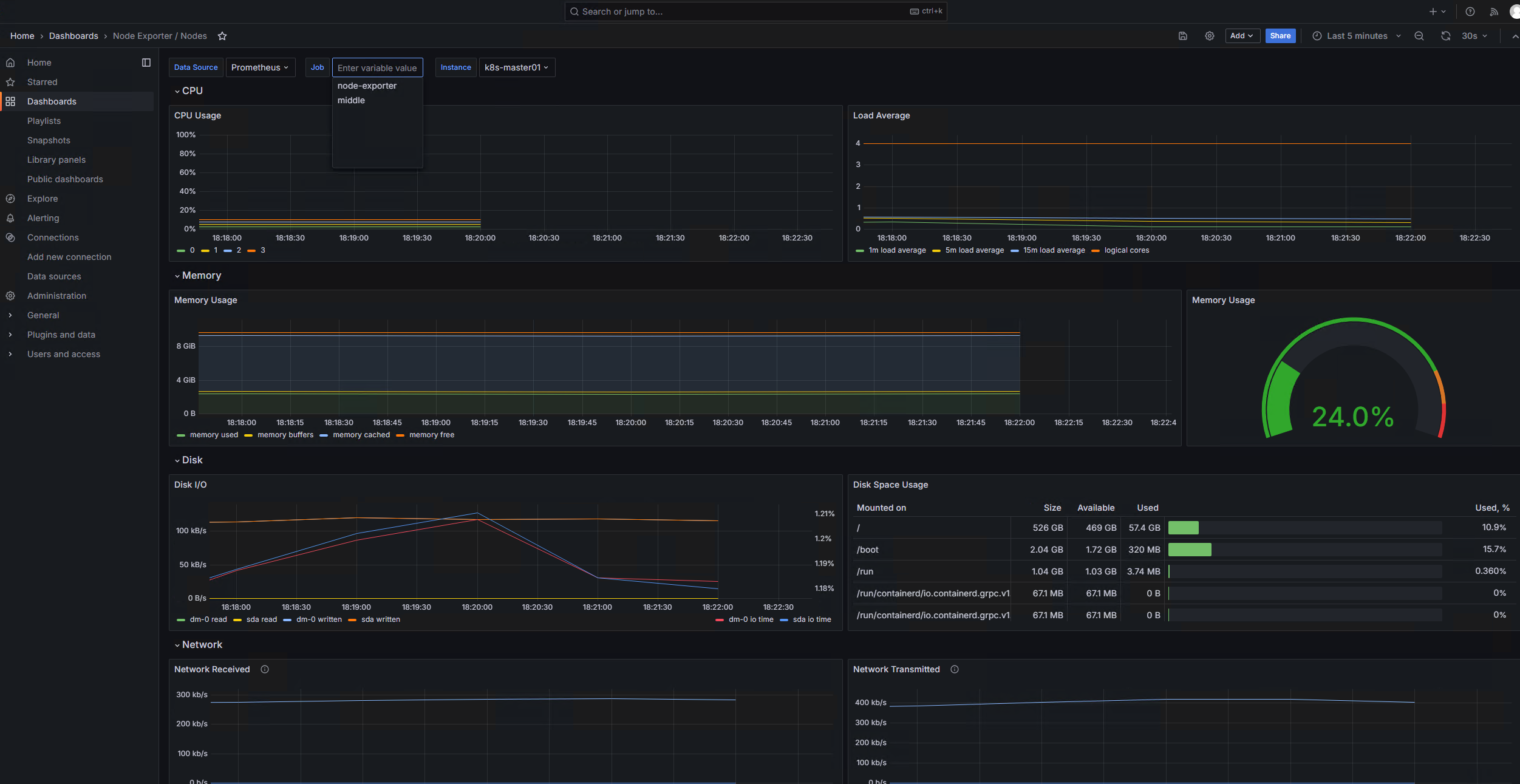 The Node Exporter / Nodes by jobs dashboard uses the prometheus data source to create a Grafana dashboard with the gauge, table and timeseries panels.