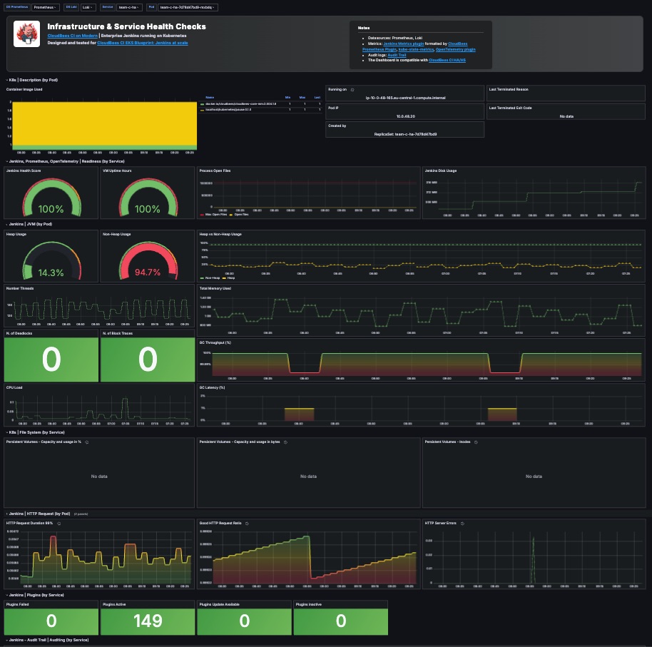 Dashboard for monitoring CloudBees CI - Jenkins infrastructure and service health. Provides visibility into Kubernetes resources, JVM metrics, HTTP requests, system events, and user edits auditing. This dashboard is compatible with HA/HS.