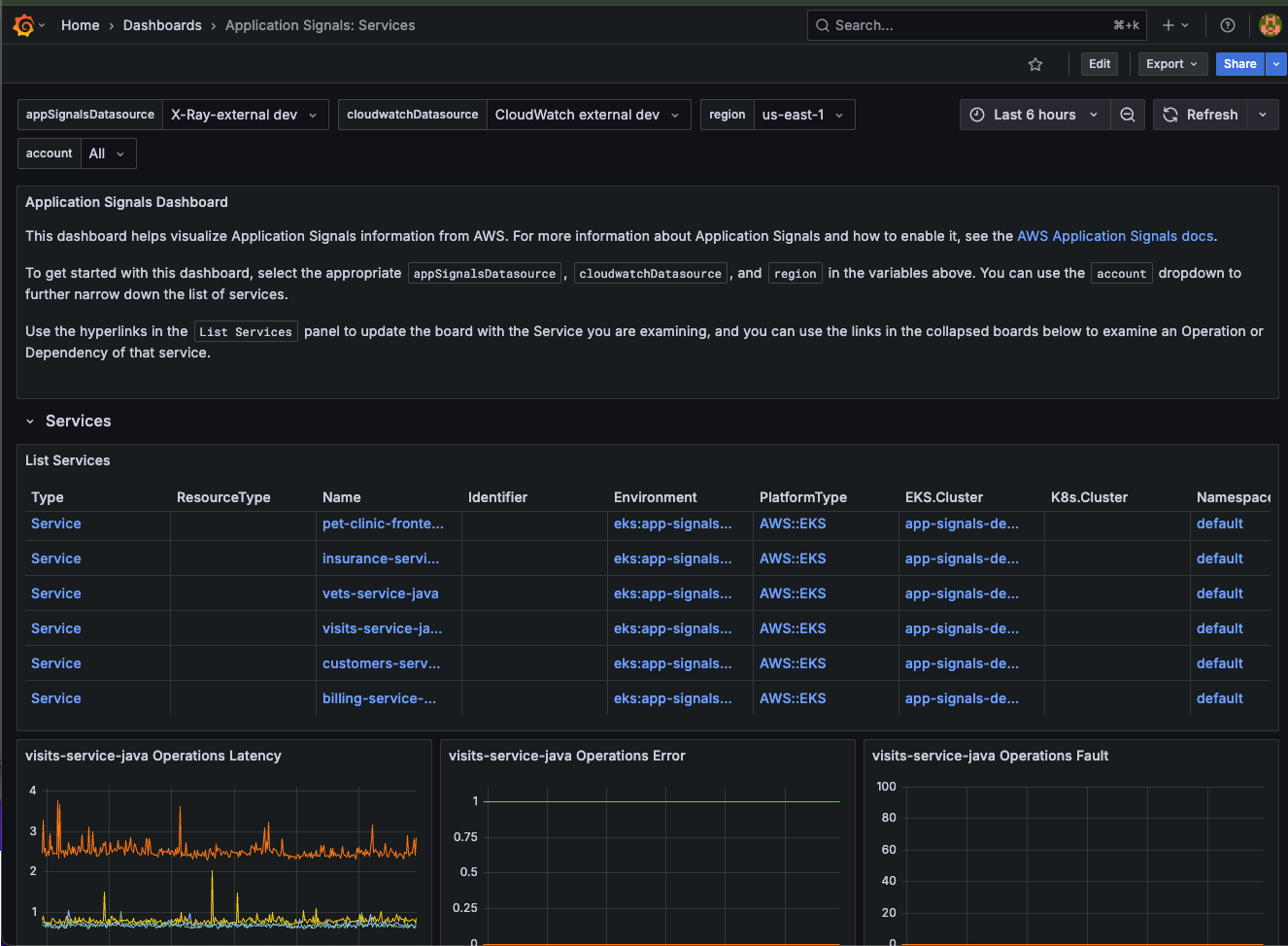 This dashboard helps visualize Service information from AWS using the Application Signals and CloudWatch plugins. For more information about Application Signals and how to enable it, see the AWS Application Signals docs. To use this dashboard, you need Appliction Signals set up in your AWS account and a CloudWatch and Application Signals (formerly X-Ray) data source.