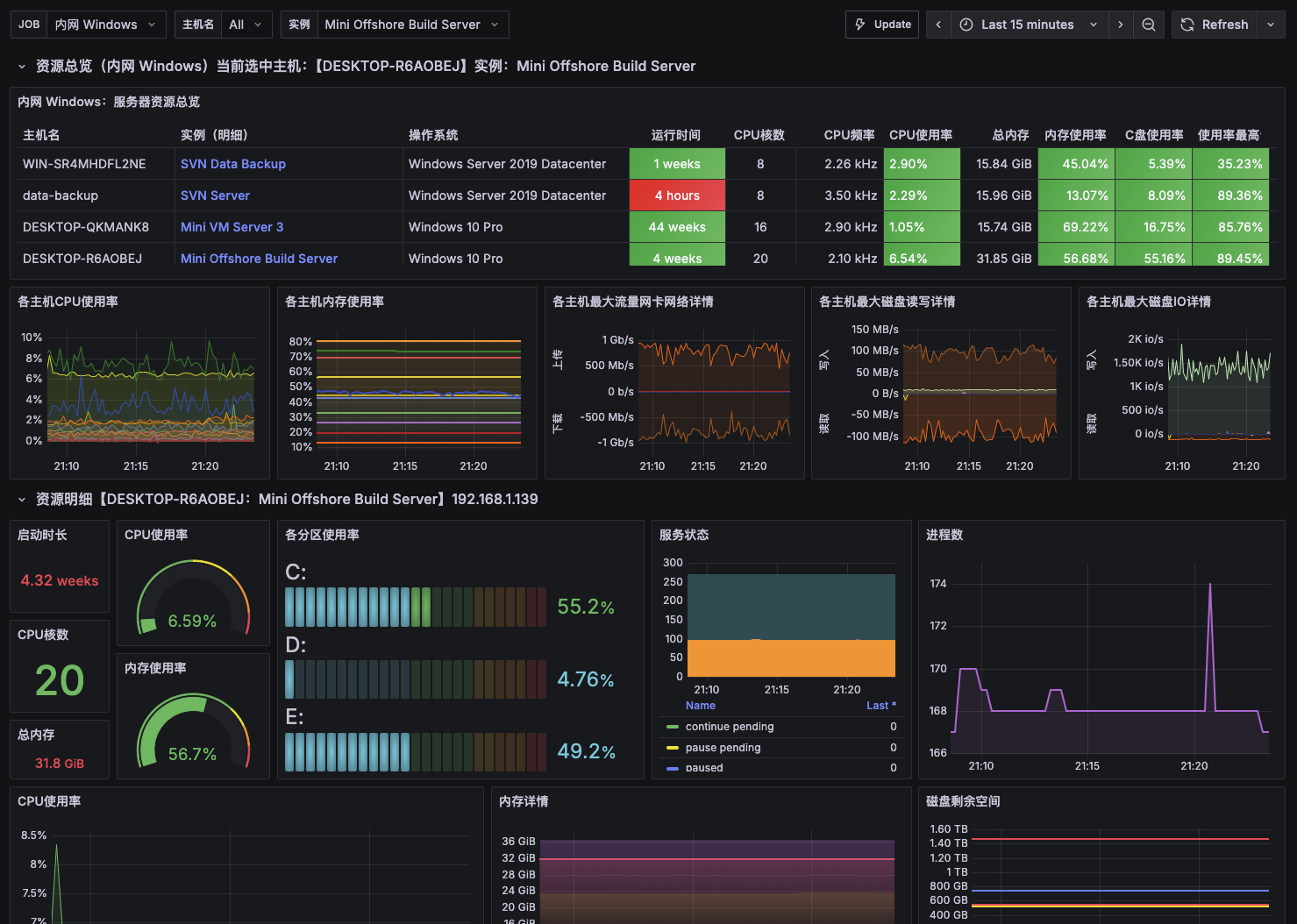 Windows的Prometheus监控看板展示,增加了资源汇总展示,优化了明细展示。更新支持windows_exporter 0.31.1。已为Grafana v12+ 优化参数。