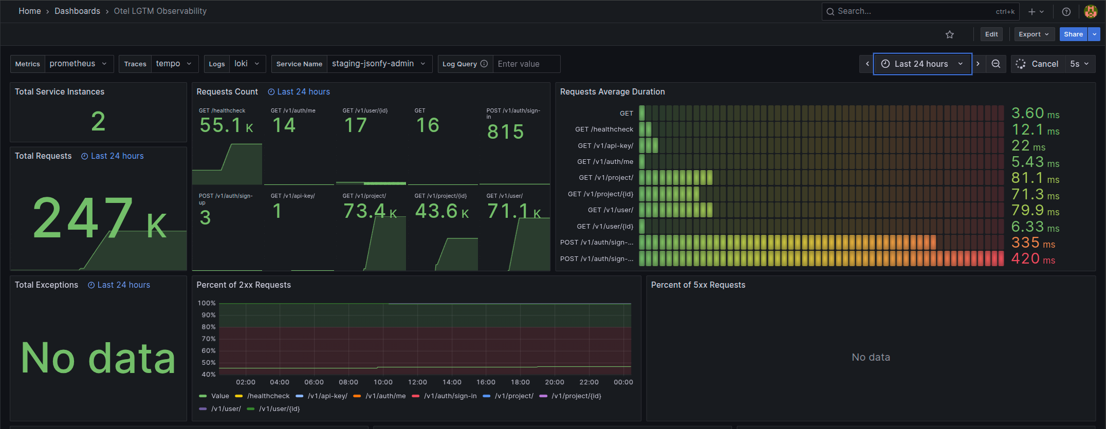 Automatic observability stack for FastAPI with OpenTelemetry: instead of exposing /metrics, all traces, metrics, and logs are collected automatically through OTEL and sent to Grafana LGTM (Loki, Grafana, Tempo, Prometheus), with optional S3 persistence and an optimized Docker setup.