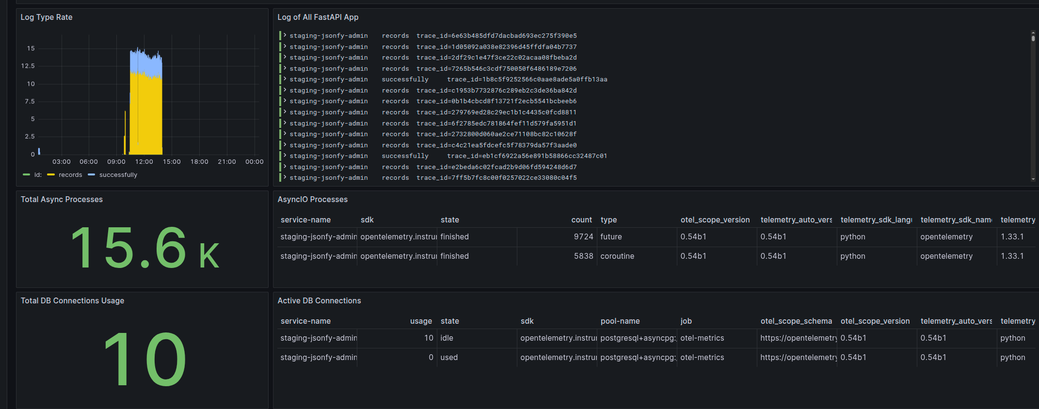 Telemetry FastAPI application Dashboard with three pillars of observability on Grafana: