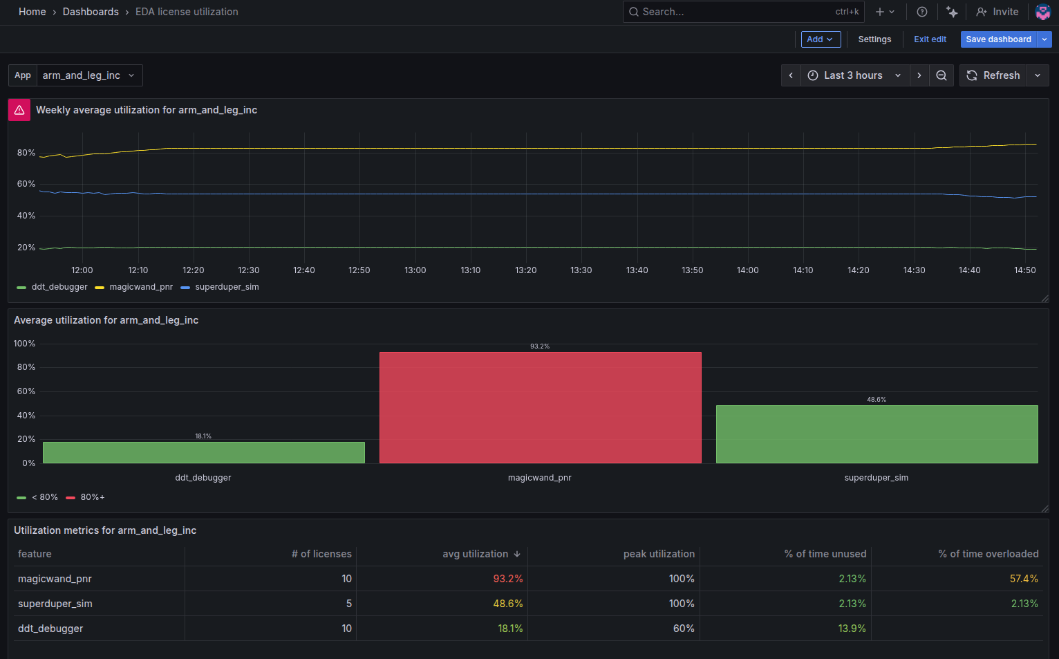 EDA license utilization summary with average and peak usage. This dashboard uses data from FLEXlm Exporter utility.