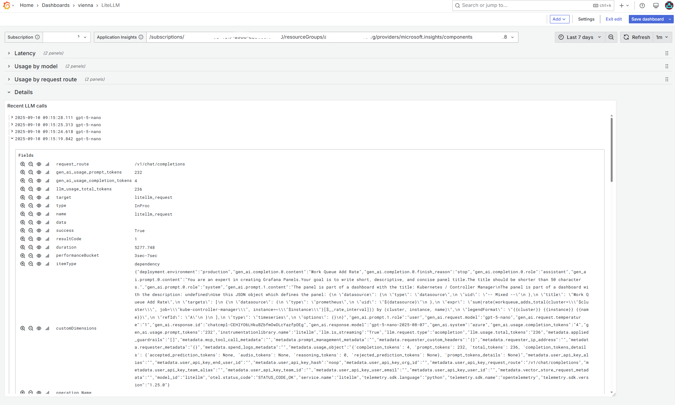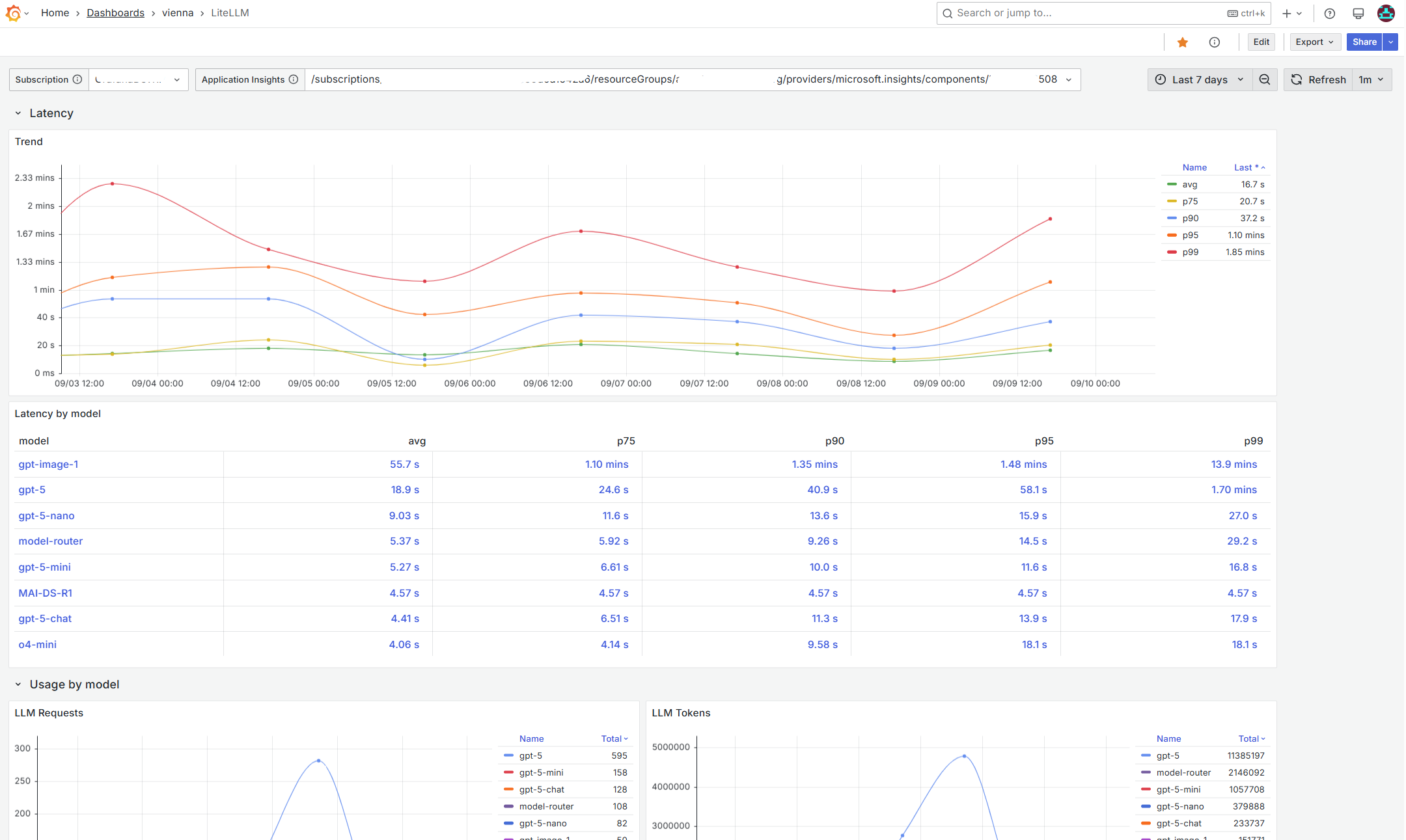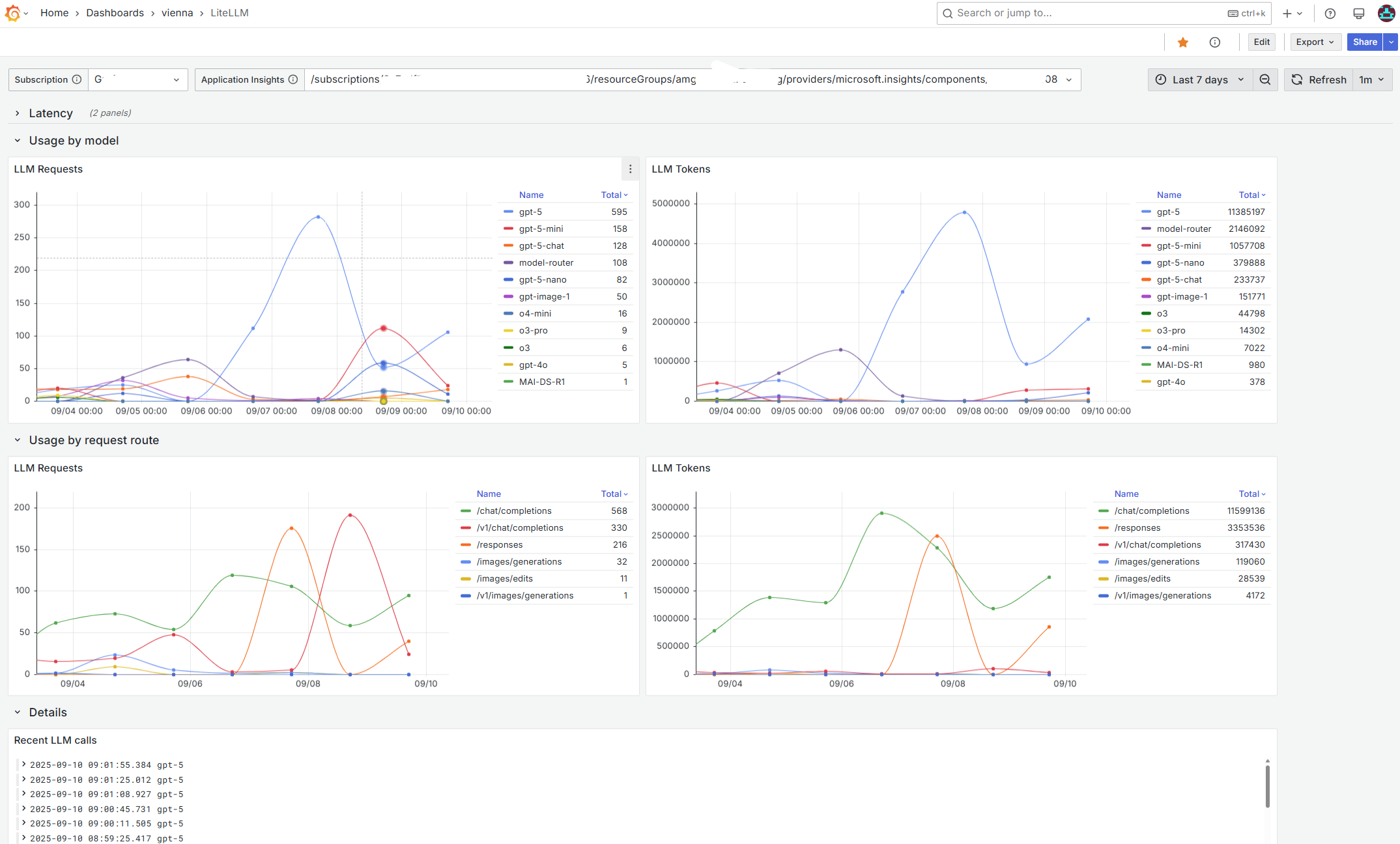End-to-end LiteLLM observability using Azure Monitor (Application Insights) in Grafana. Track request latency percentiles (avg, p75/p90/p95/p99), request and token usage by model and by request route, and inspect recent calls with deep links to trace details. Uses template variables for Subscription and Application Insights resource; refreshes every 5m; default time range 7d.