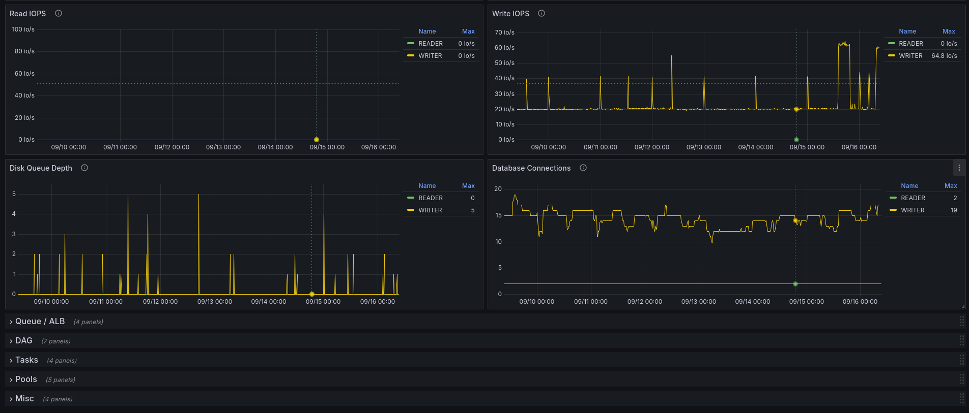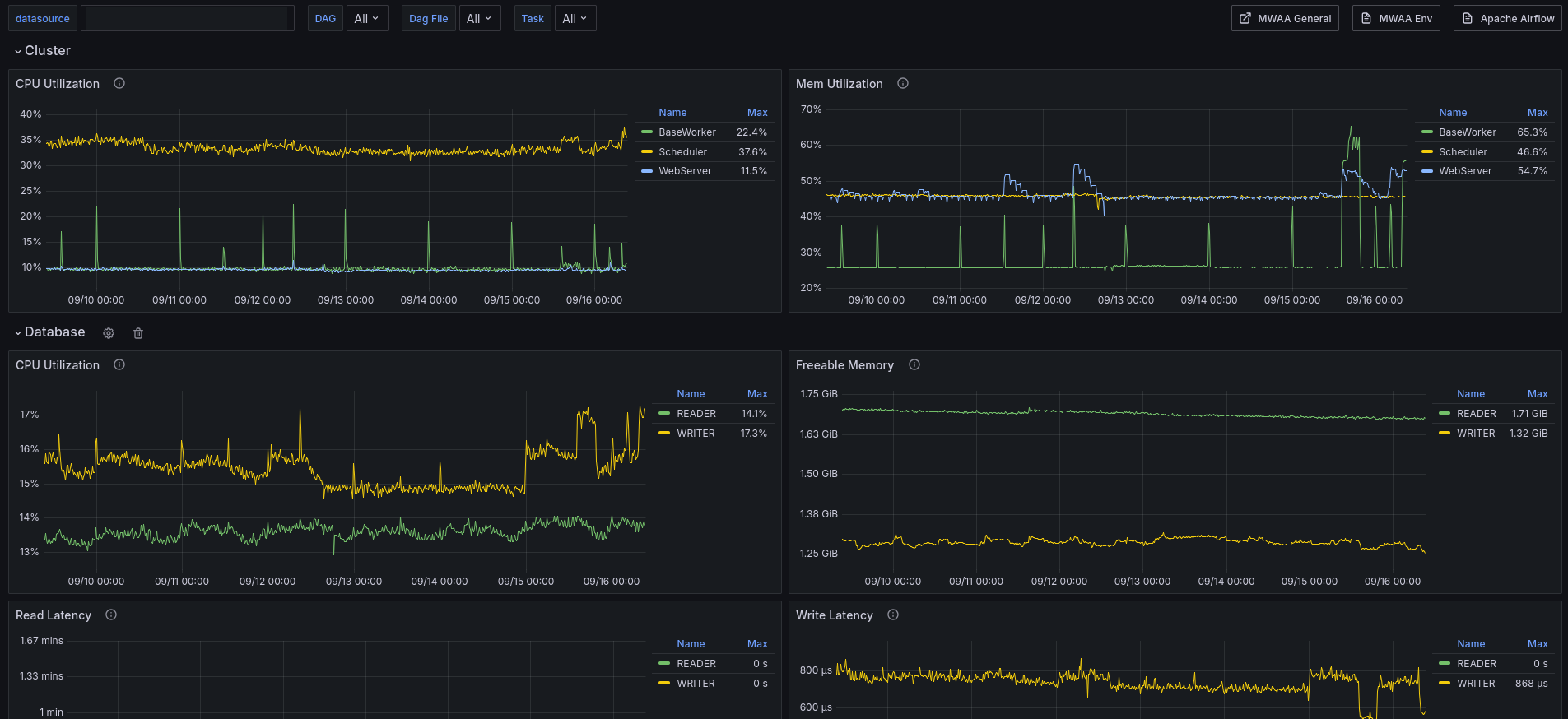 In addition to Apache Airflow metrics, you can monitor the underlying components of your Amazon Managed Workflows for Apache Airflow environments using CloudWatch, which collects raw data and processes data into readable, near real-time metrics. With these environment metrics, you will have greater visibility into key performance indicators to help you appropriately size your environments and debug issues with your workflows. These metrics apply to all supported Apache Airflow versions on Amazon MWAA.