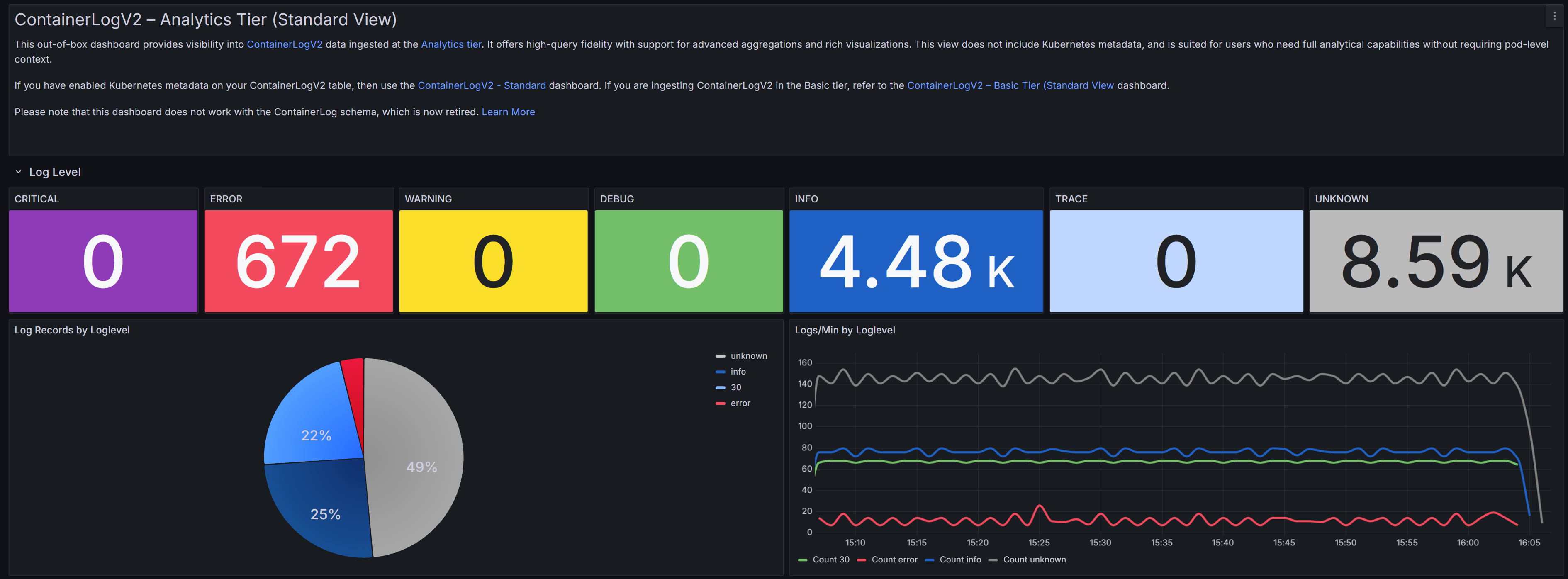 The Azure / Insights / Containers / ContainerLogV2 Analytics Tier dashboard uses the grafana-azure-monitor-datasource data source to create a Grafana dashboard with the barchart, piechart, stat, table, text and timeseries panels.