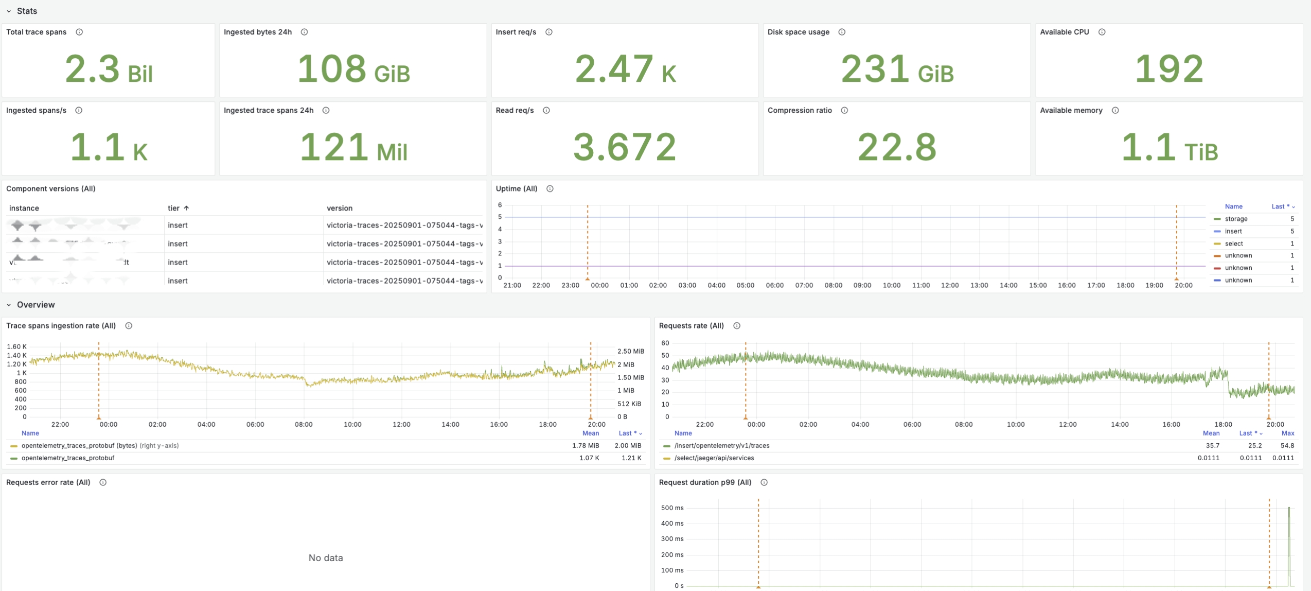 • Stats - High-level metrics including total trace spans, ingestion rates, disk usage, and system version information