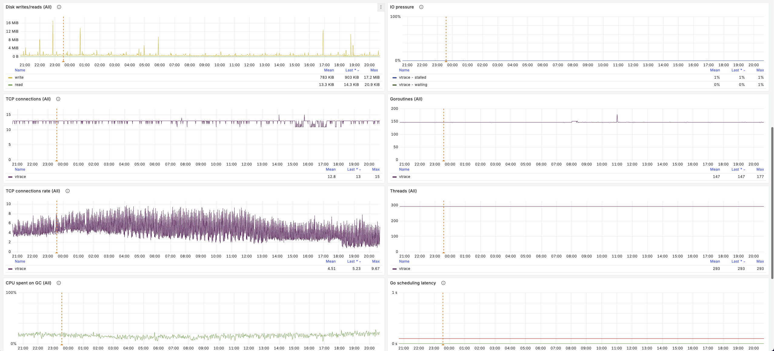 • Resource usage - CPU utilization, memory consumption, network activity, garbage collection metrics, and system pressure indicators