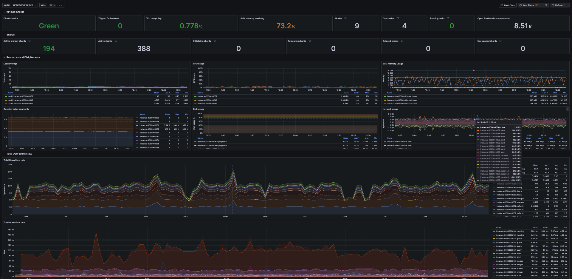 This dashboard uses elasticsearch-exporter to collect metrics from Elastic Cloud or self-hosted Elasticsearch clusters. It enables real-time visibility into search performance, cluster health, and resource utilization.