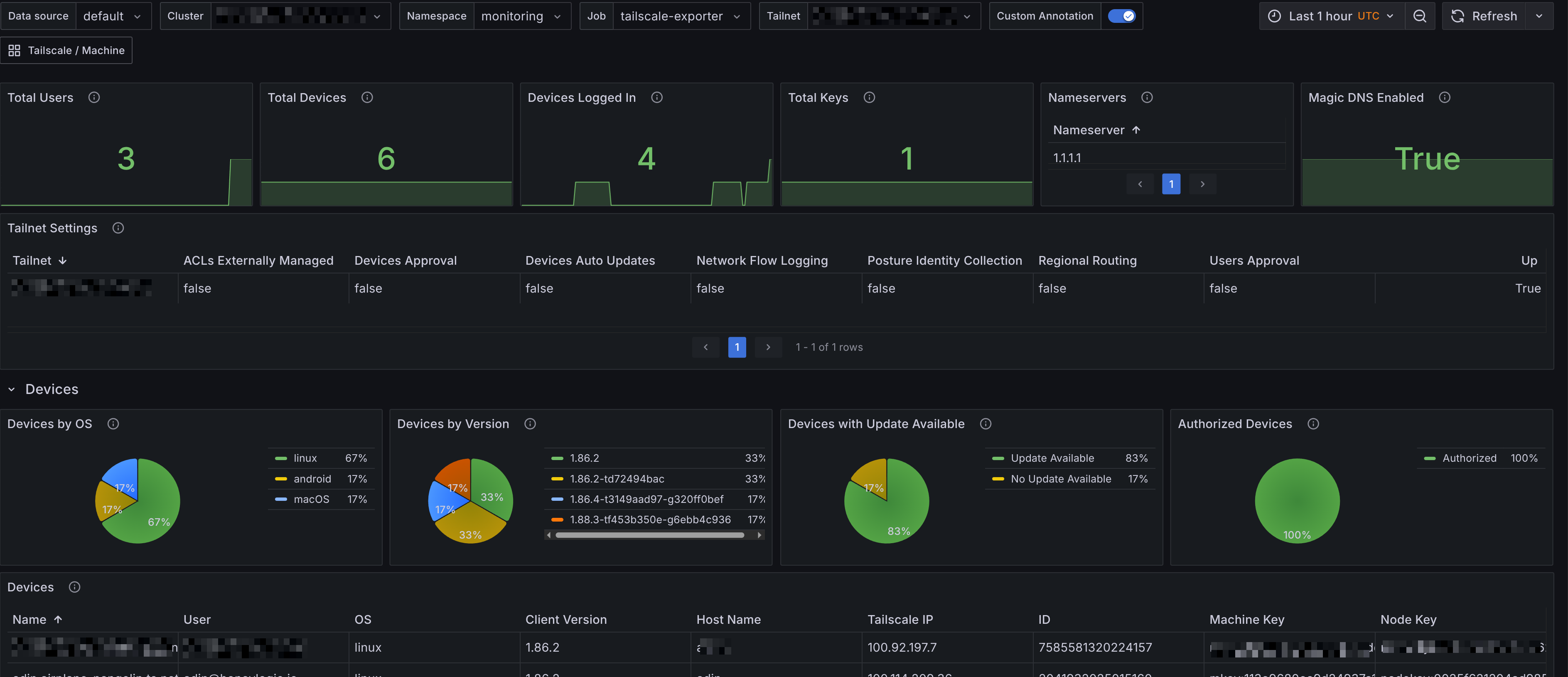 A dashboard that gives an overview of Tailscale API metrics. The dashboards were generated using tailscale-mixin. Open issues and create feature requests in the repository.