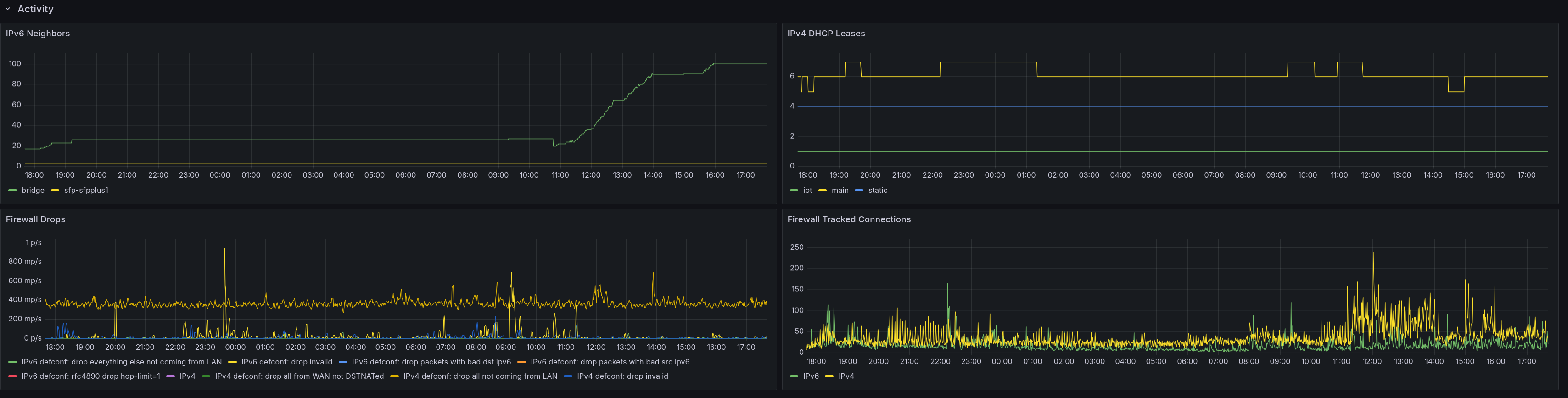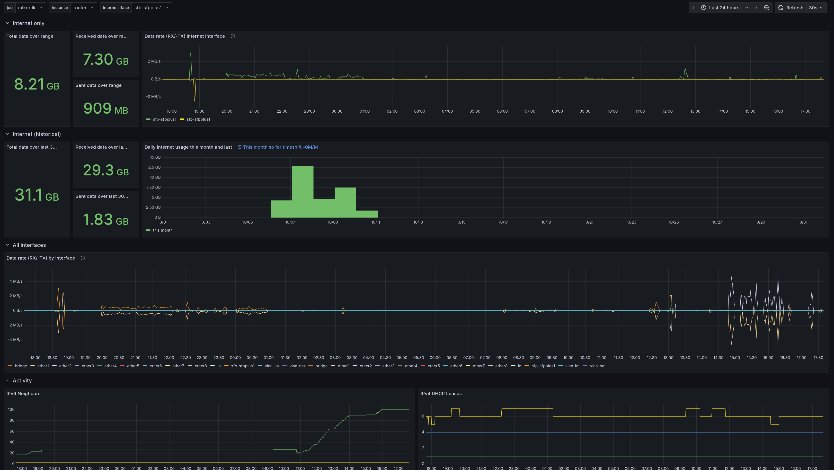 A dashboard which show metrics about a MikroTik router. It uses Prometheus, with data gathered from the https://github.com/jodersky/mikrotik-exporter exporter.