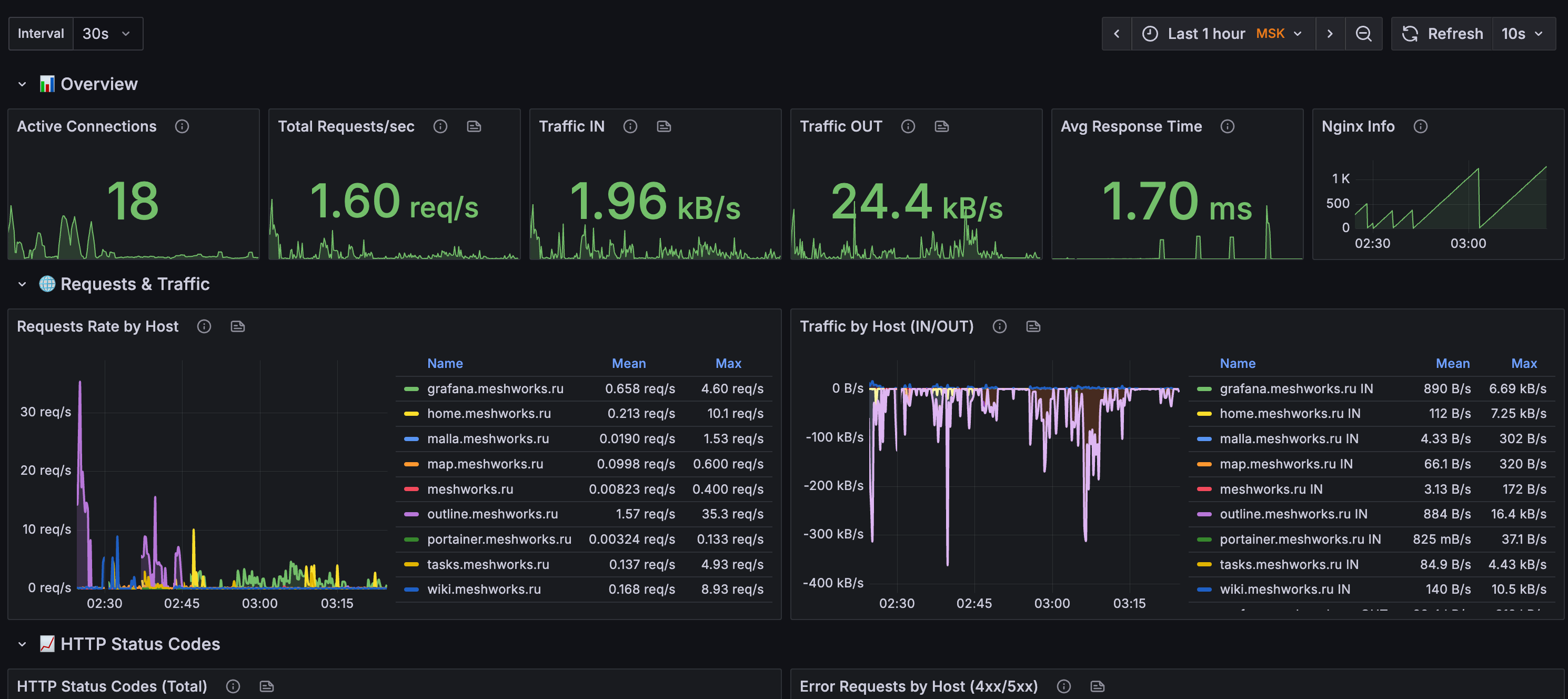 Features: Overview metrics, HTTP status tracking Upstream backend monitoring Connection & cache statistics Dynamic time intervals (30s-15m) Detailed per-host/upstream tables