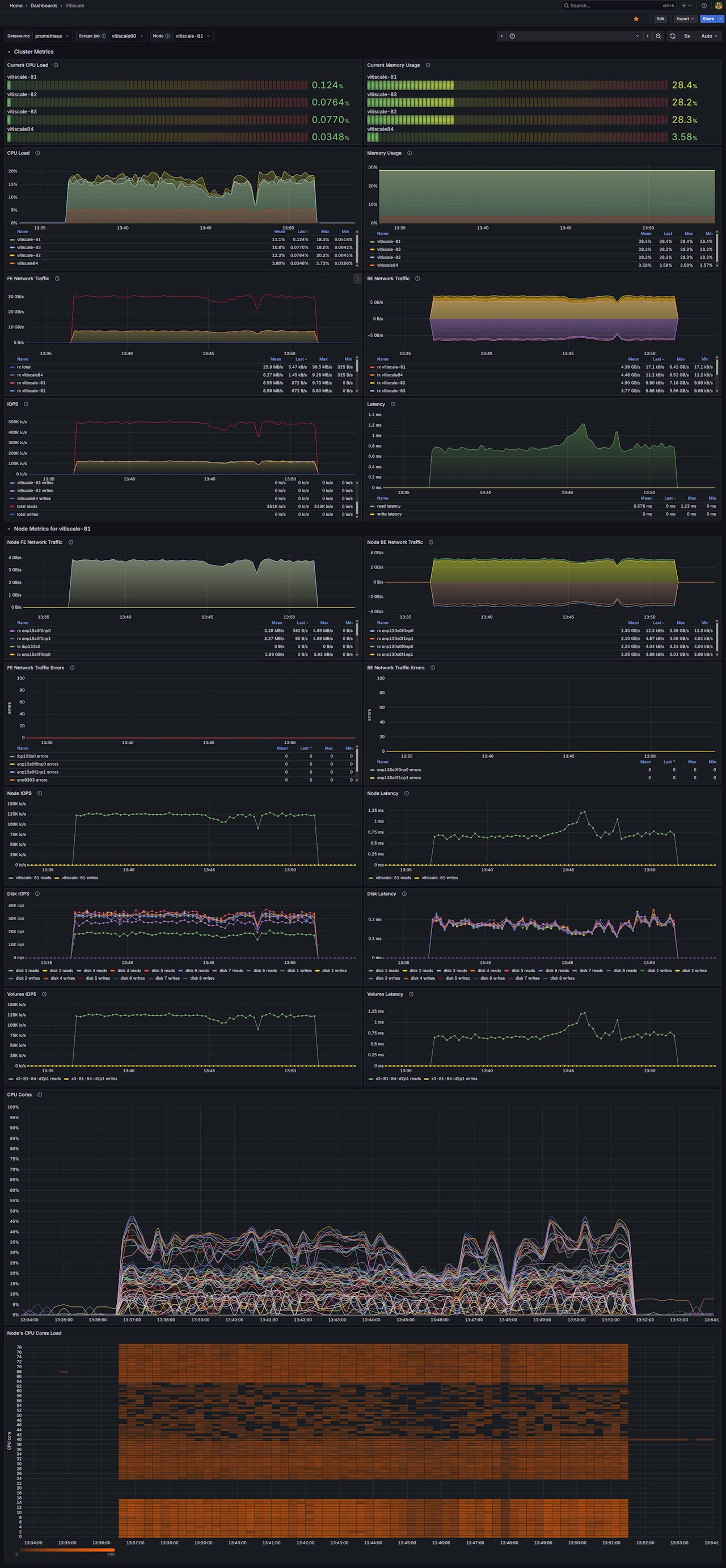 Vitiscale storage cluster monitoring dashboard with CPU, memory, disk, and network metrics