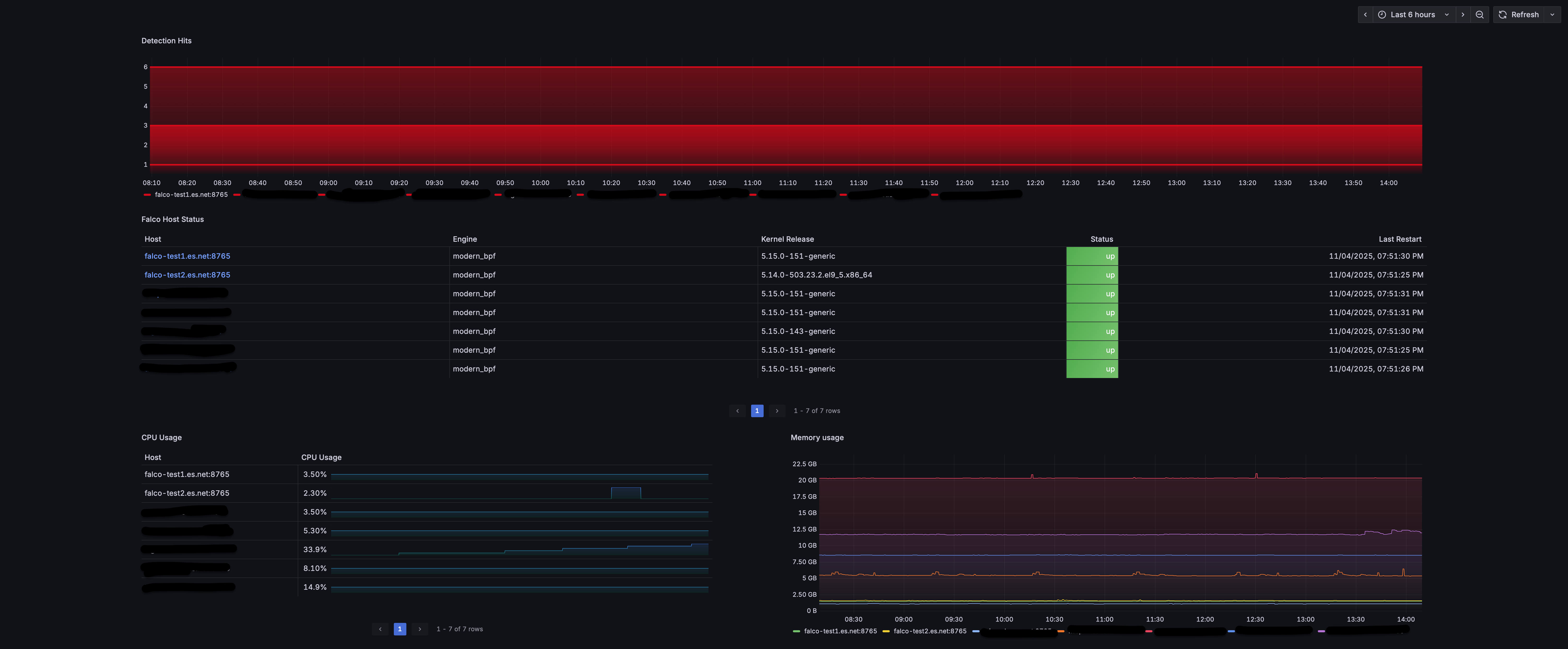 The Falco Overview Dashboard dashboard uses the prometheus data source to create a Grafana dashboard with the table and timeseries panels.