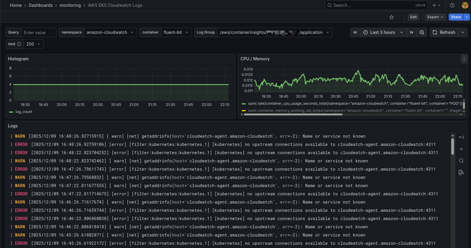 AWS EKS CloudWatch Logs dashboard with Kubernetes namespace and container filtering. Shows log histogram and detailed log viewer.
