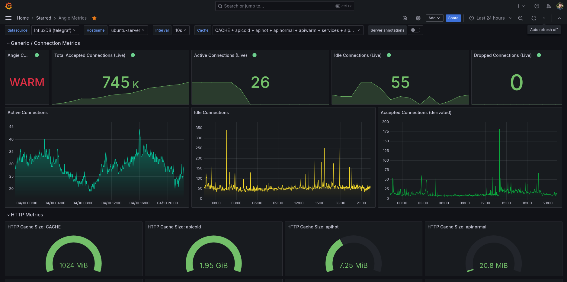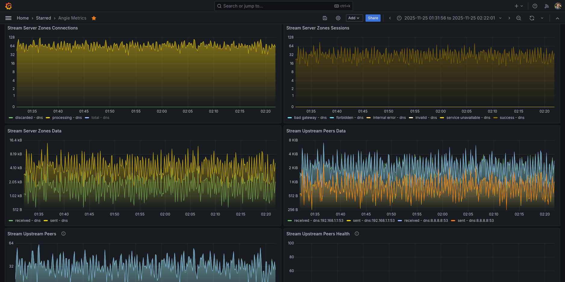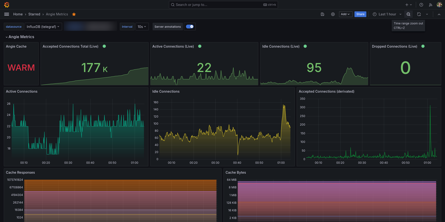 Angie metrics dashboard, it's collecting data via Telegraf (using my own Angie Telegraf input plugin).