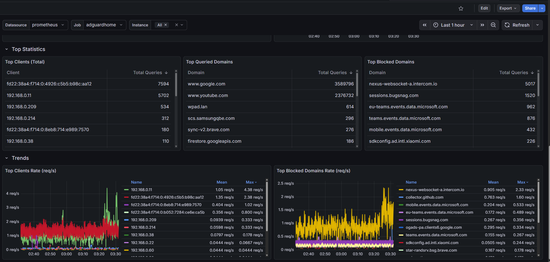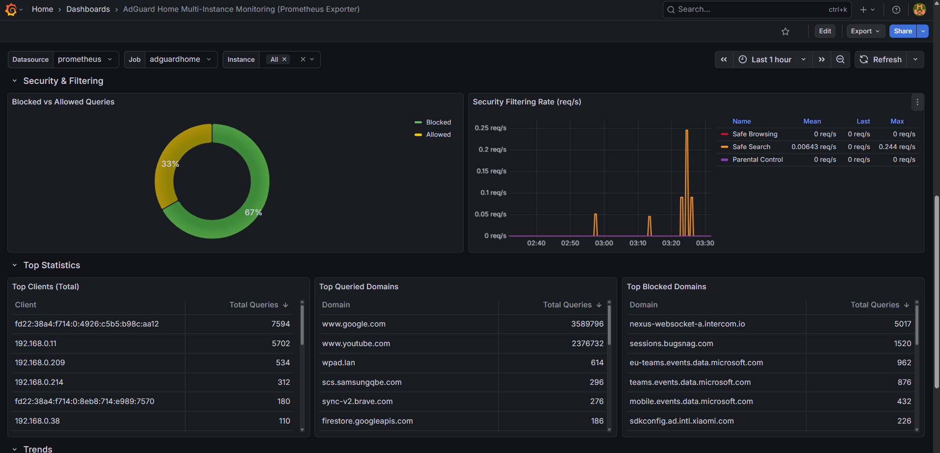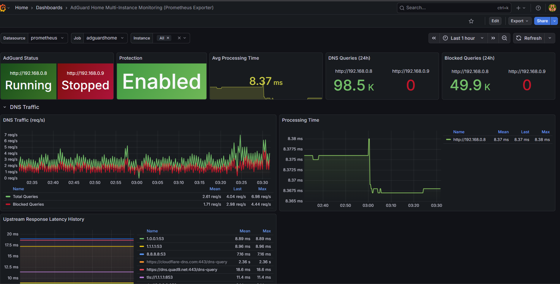 Grafana dashboard for monitoring multiple AdGuard Home instances using the AdGuard Home Exporter. Provides clean visual insights into DNS queries, blocks, client activity, upstream performance, filter usage, and instance health. Fully supports multi-instance monitoring via your Prometheus exporter: https://github.com/JonanekDev/AdGuardHome-Exporter