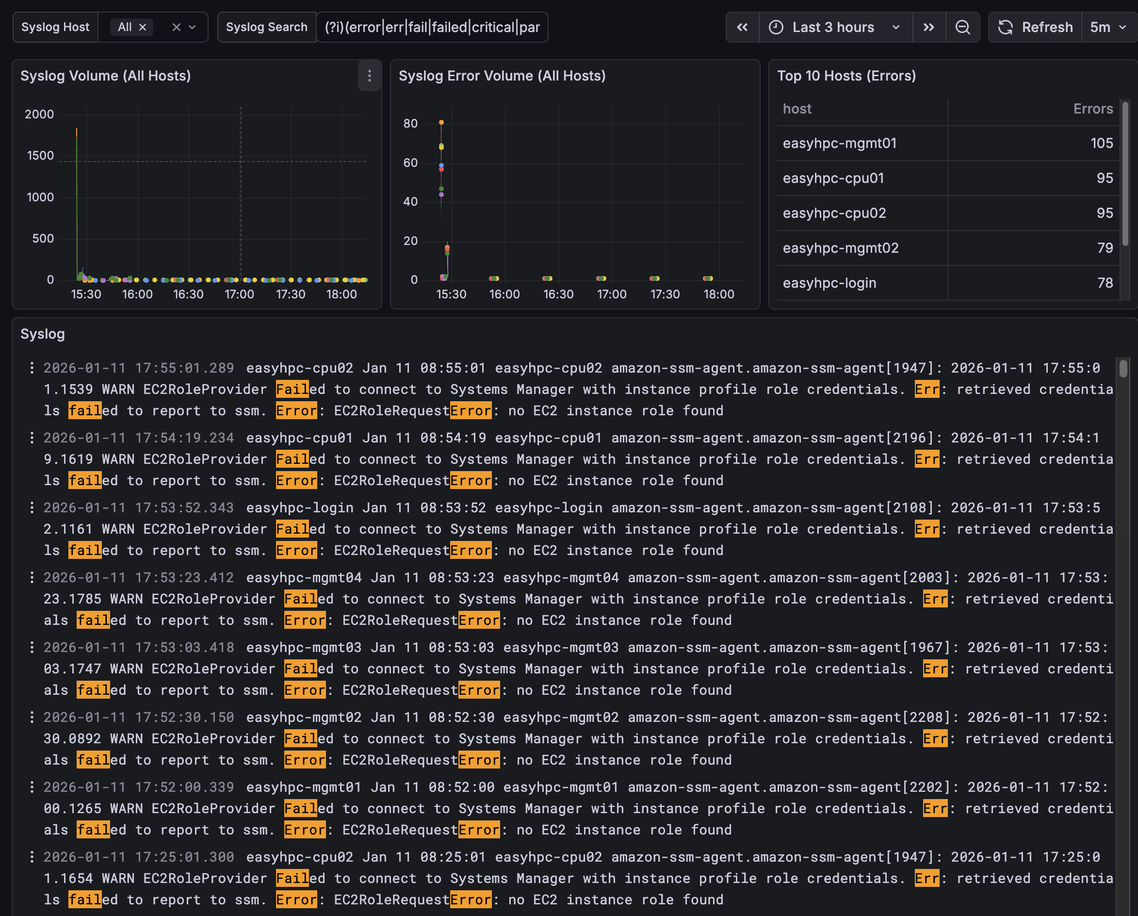 A Grafana dashboard for monitoring and analyzing syslog data in an EasyHPC environment using Loki.