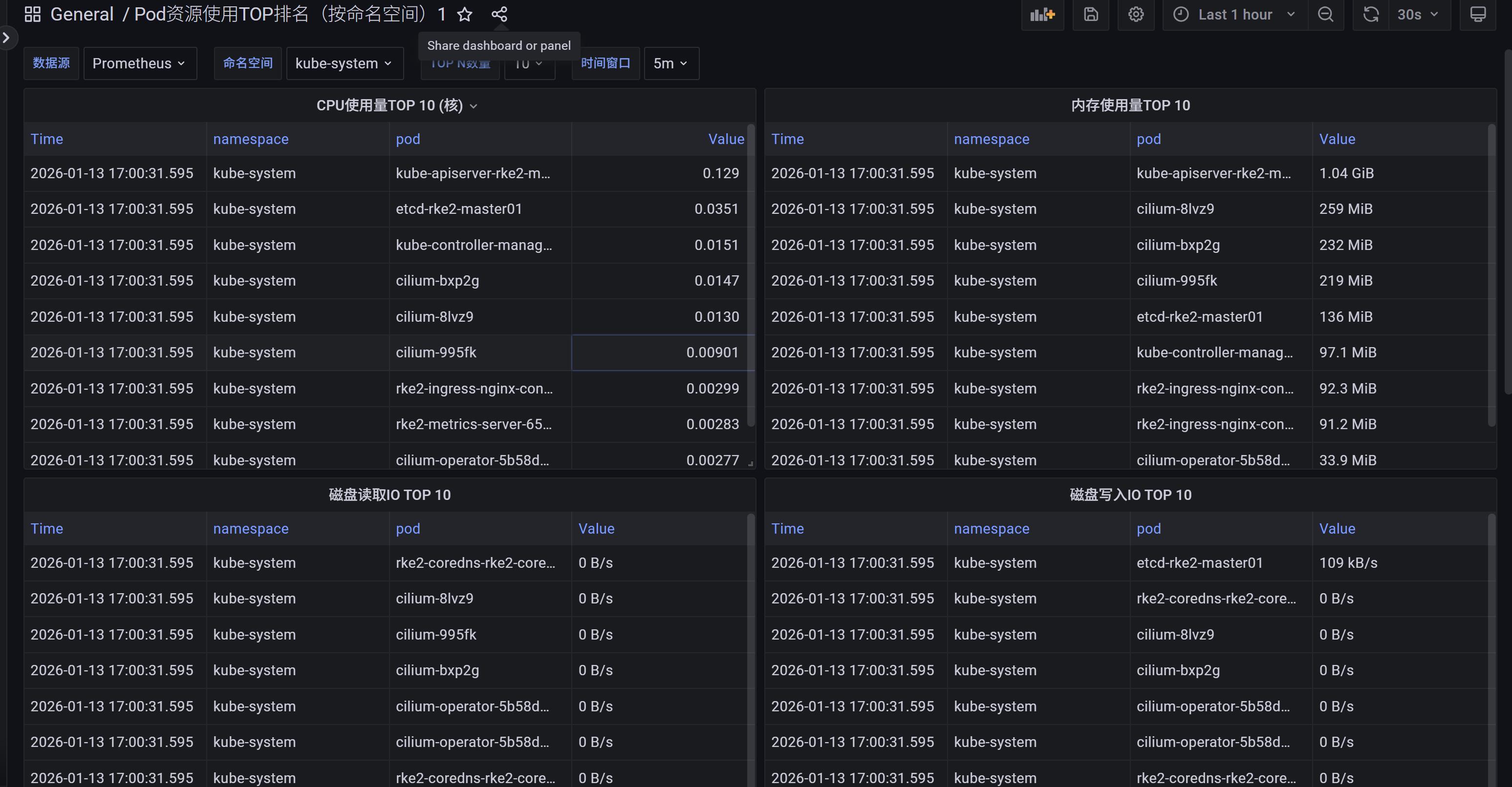 此dashboard可用于按命名空间统计并排名 Pod 的 CPU、内存、磁盘 IO、网络流量等资源使用 TOP N,帮助快速定位资源消耗异常的 Pod。